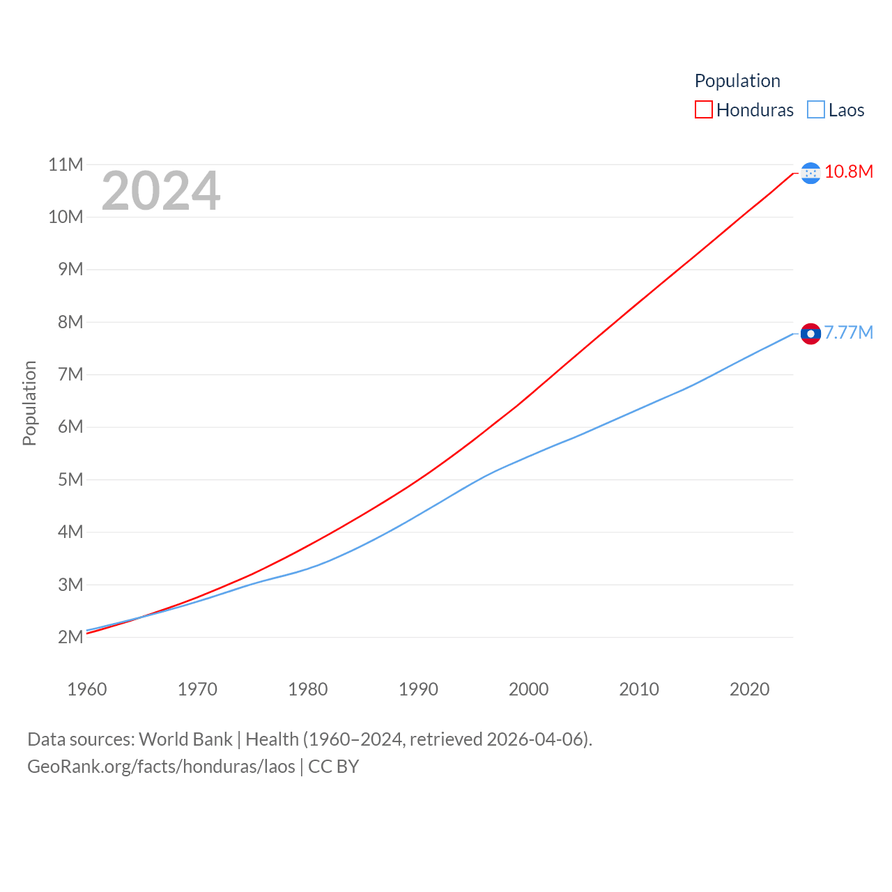 Honduras has a population of 10.8M (ranked 89/197), compared with 7.77M in Laos (ranked 103/197). Honduras' land area is 43,201 sq mi versus 89,112 sq mi for Laos (ranked 100th vs. 79th).