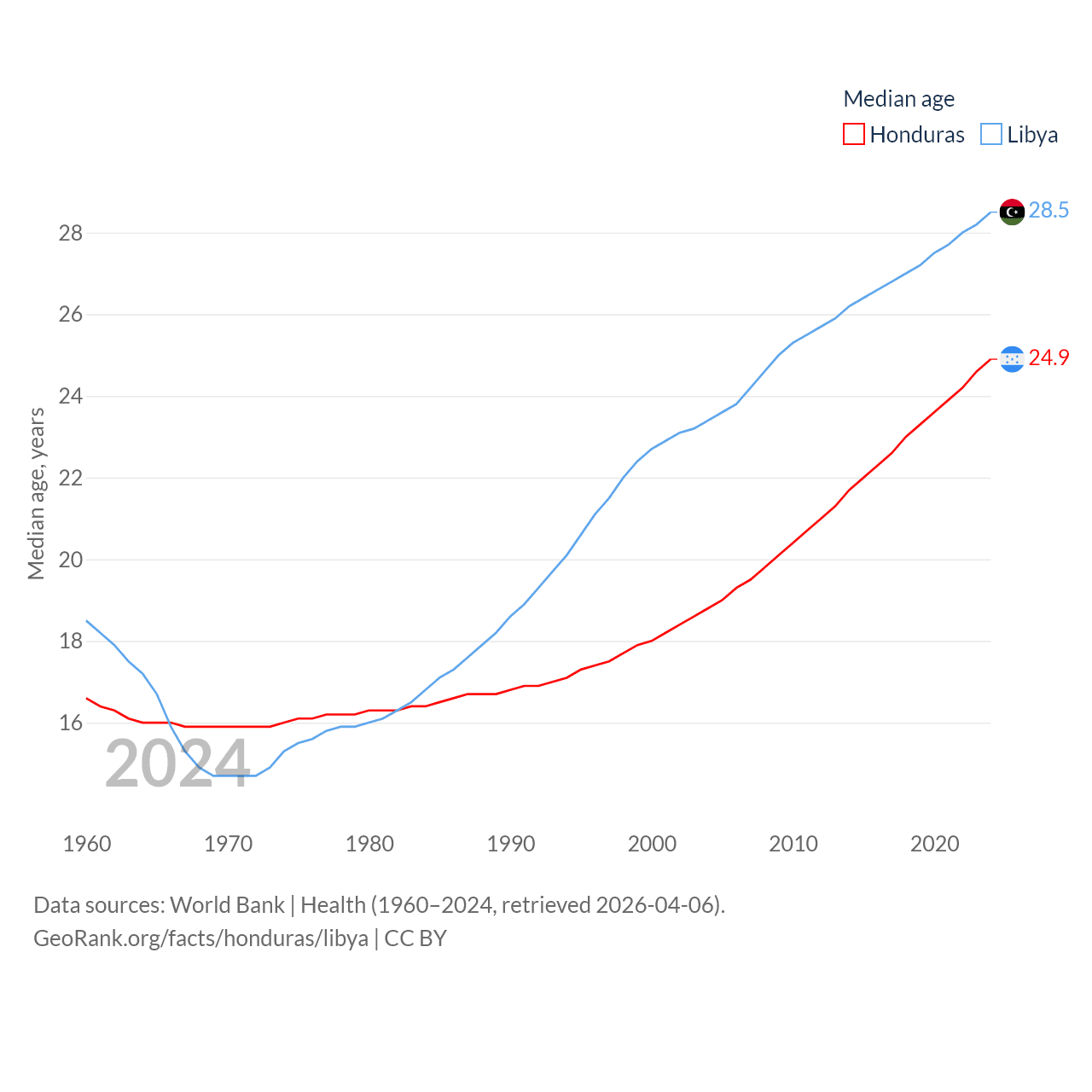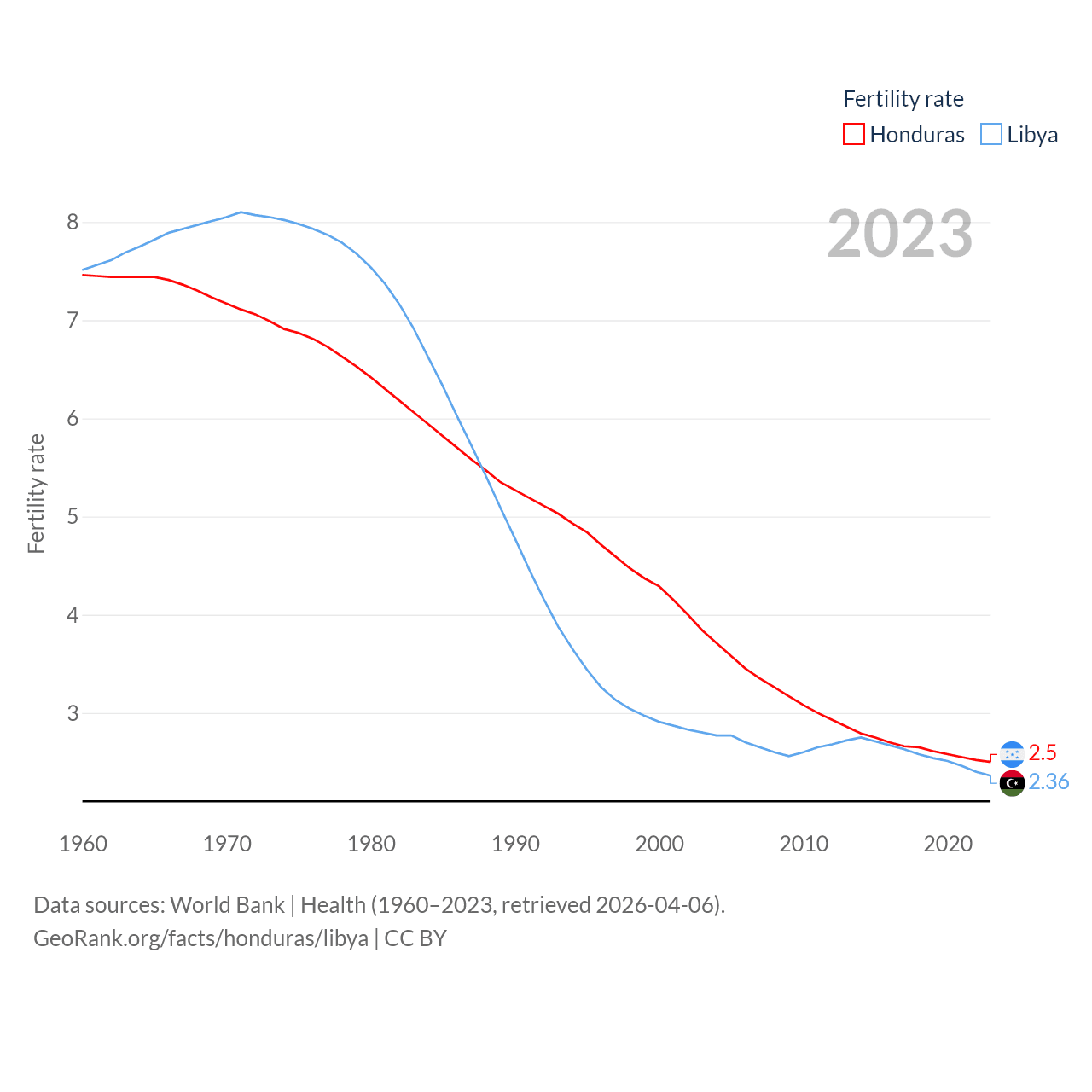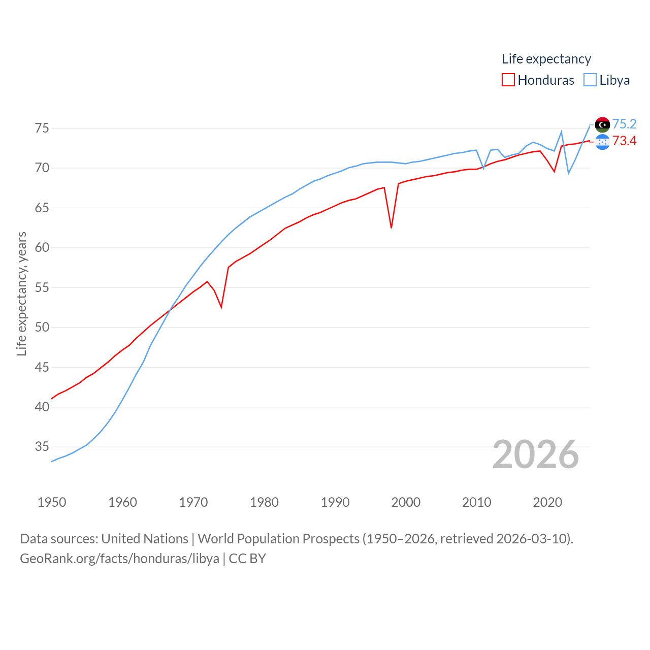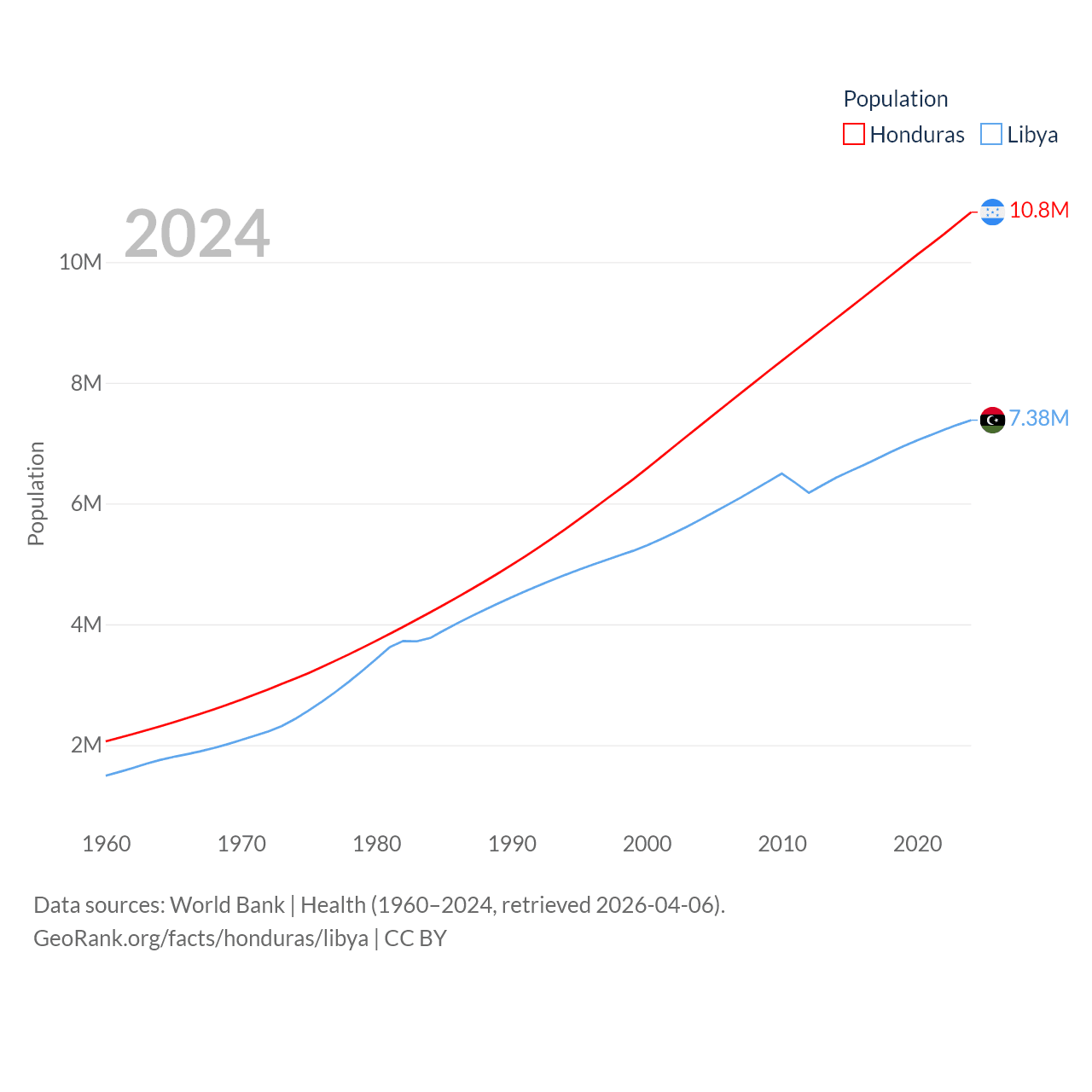 Honduras has a population of 10.8M (ranked 89/197), compared with 7.38M in Libya (ranked 105/197). Honduras' land area is 43,201 sq mi versus 679,362 sq mi for Libya (ranked 100th vs. 16th).