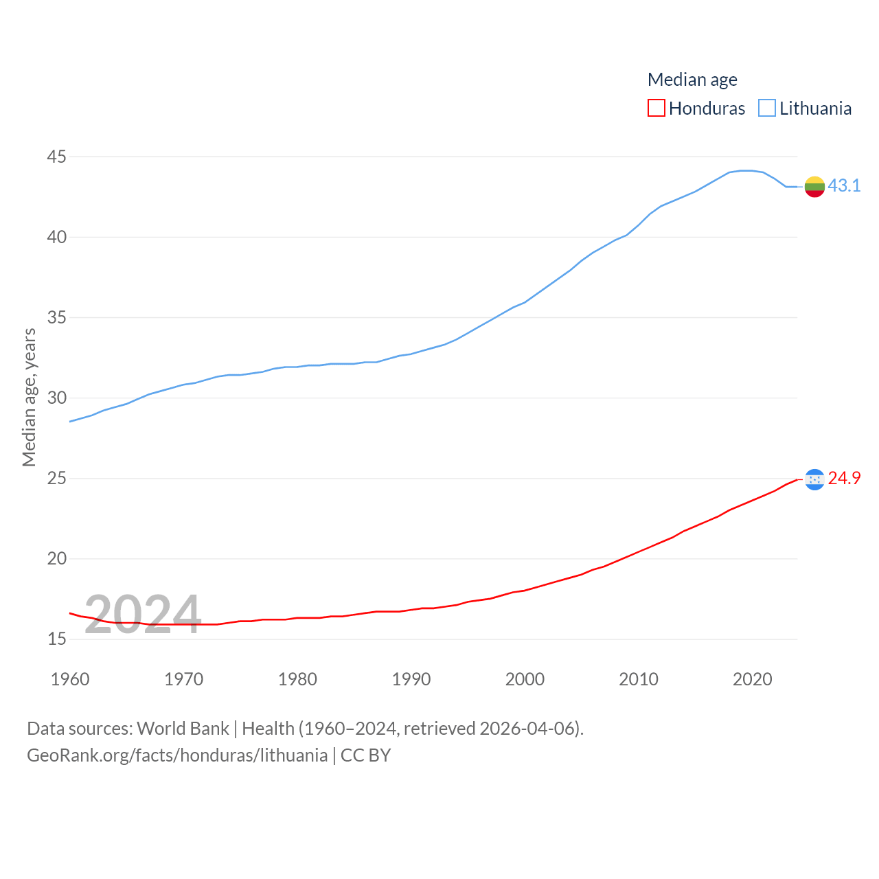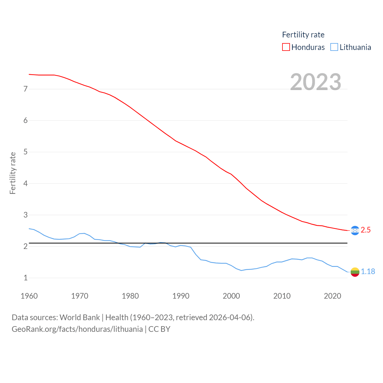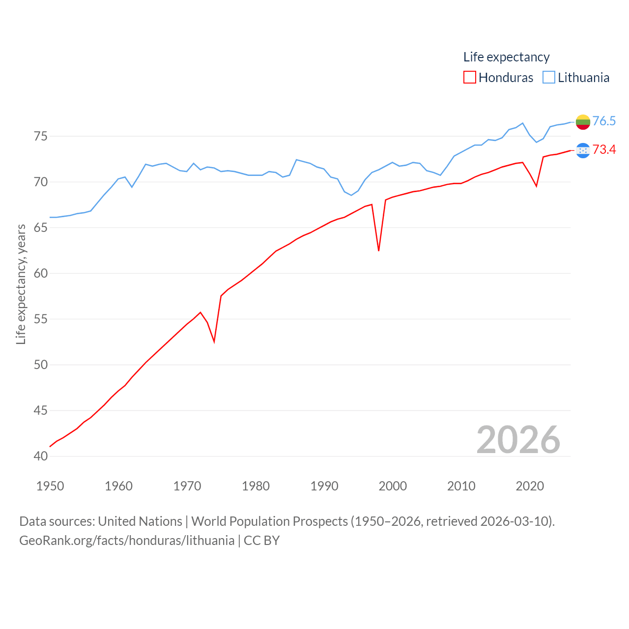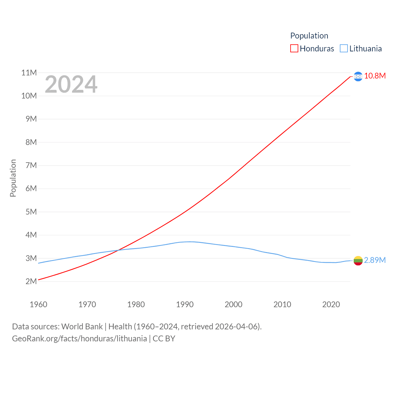 Honduras has a population of 10.8M (ranked 89/197), compared with 2.89M in Lithuania (ranked 137/197). Honduras' land area is 43,201 sq mi versus 24,170 sq mi for Lithuania (ranked 100th vs. 120th).