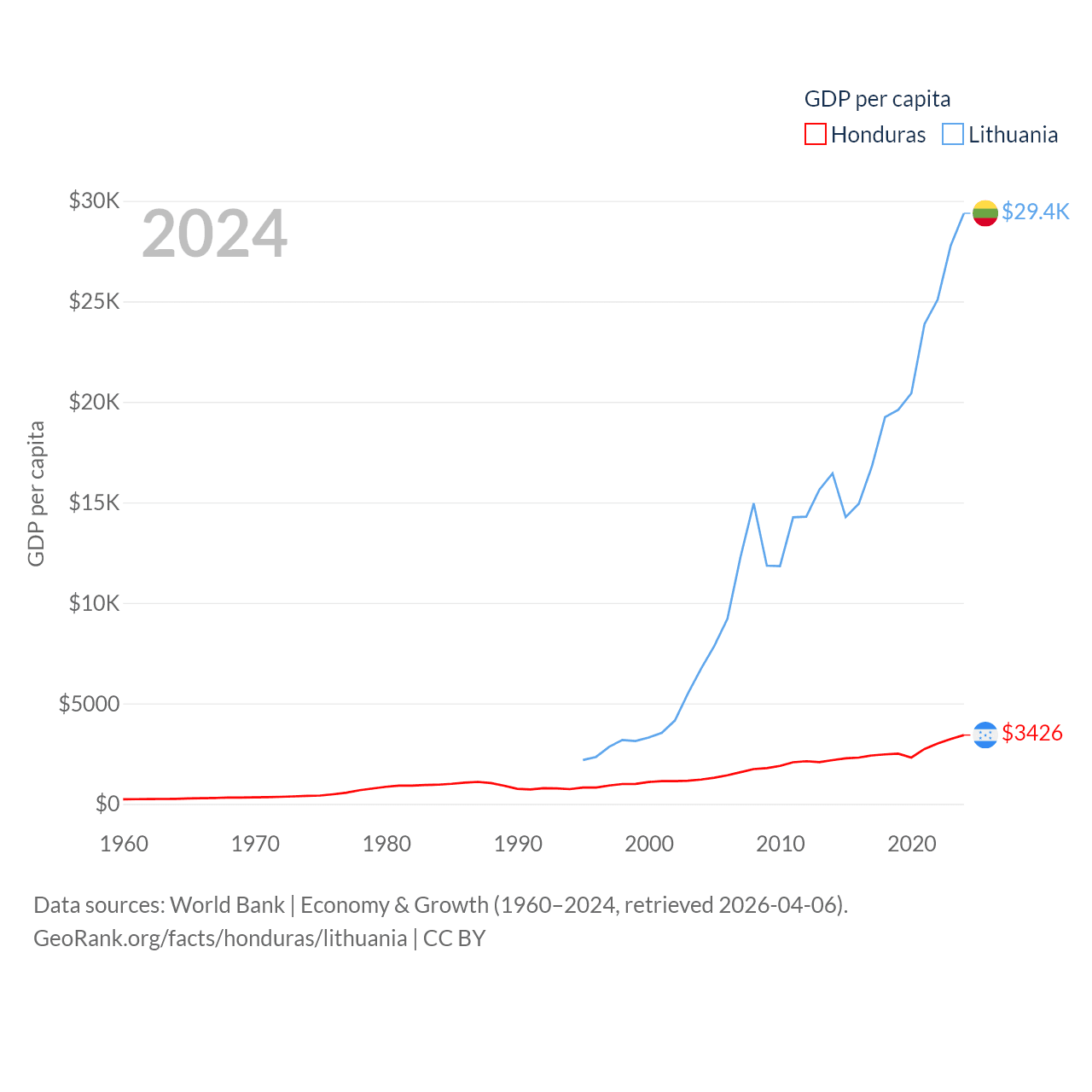 By GDP, Honduras ranks 104/197 ($37.1B) and Lithuania ranks 79/197 ($84.9B). By GDP per capita, Honduras ranks 136/197 ($3,426), while Lithuania ranks 43/197 ($29,384).