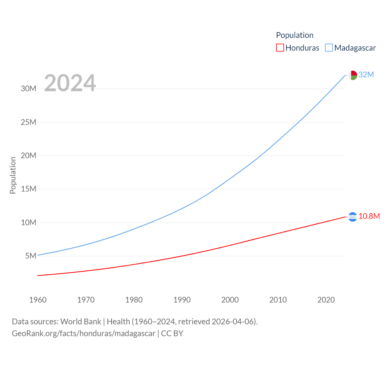 Honduras has a population of 10.8M (ranked 89/197), compared with 32M in Madagascar (ranked 49/197). Honduras' land area is 43,201 sq mi versus 224,634 sq mi for Madagascar (ranked 100th vs. 44th).