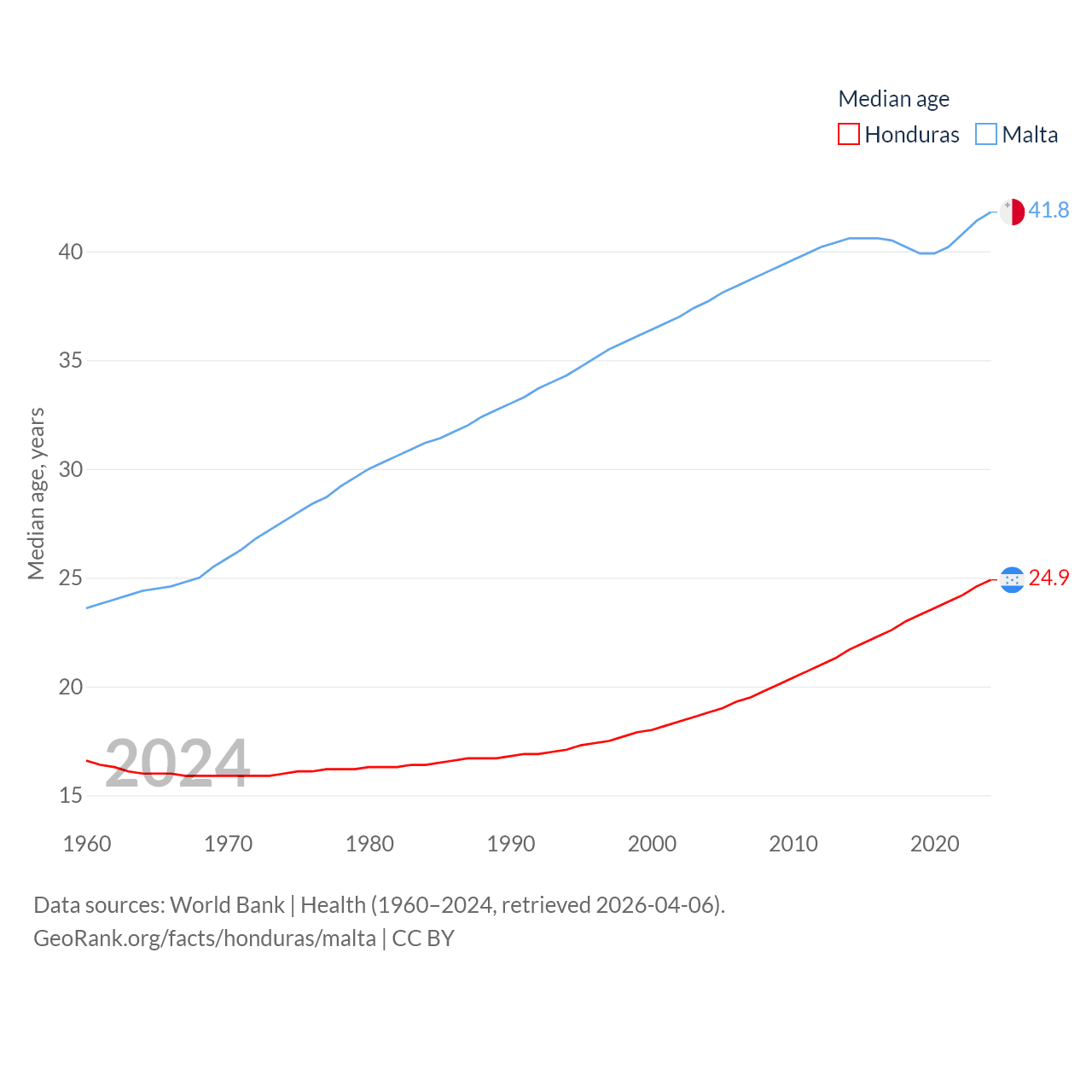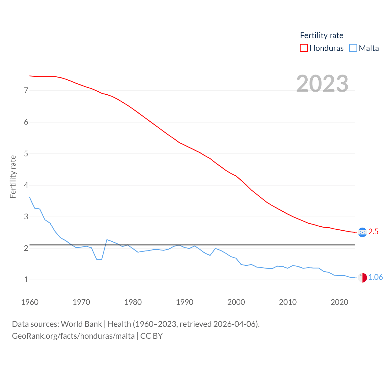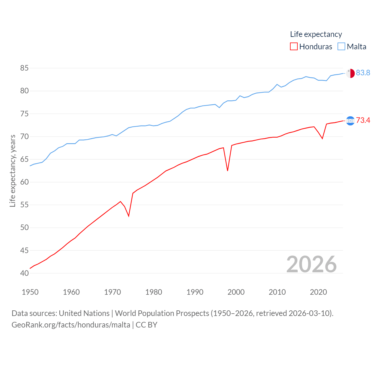 Honduras has a population of 10.8M (ranked 89/197), compared with 569K in Malta (ranked 167/197). Honduras' land area is 43,201 sq mi versus 123.6 sq mi for Malta (ranked 100th vs. 187th).
