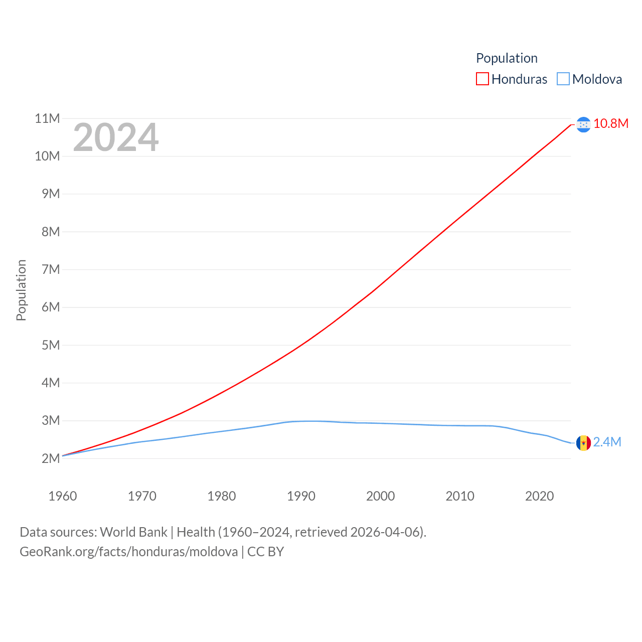 Honduras has a population of 10.8M (ranked 89/197), compared with 2.4M in Moldova (ranked 143/197). Honduras' land area is 43,201 sq mi versus 12,714 sq mi for Moldova (ranked 100th vs. 135th).