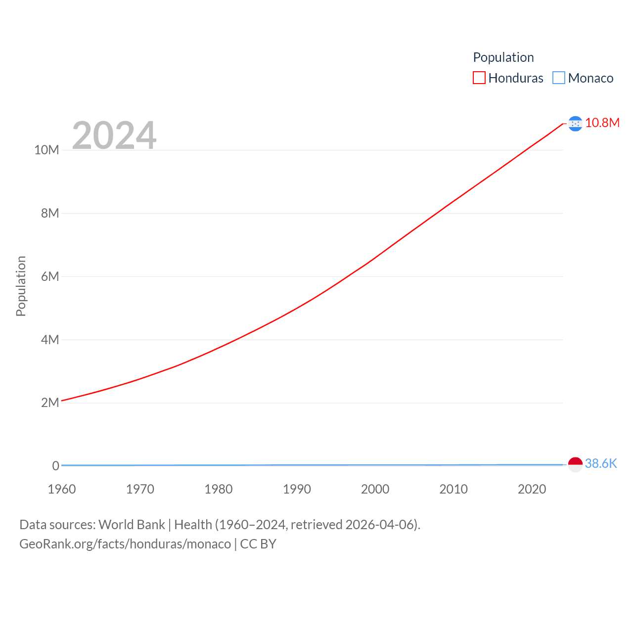 Honduras has a population of 10.8M (ranked 89/197), compared with 38.6K in Monaco (ranked 191/197). Honduras' land area is 43,201 sq mi versus 0.8 sq mi for Monaco (ranked 100th vs. 196th).