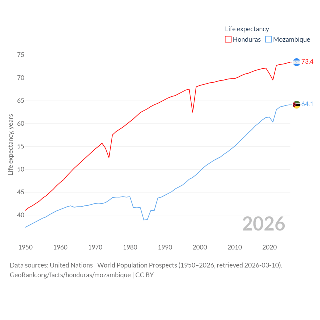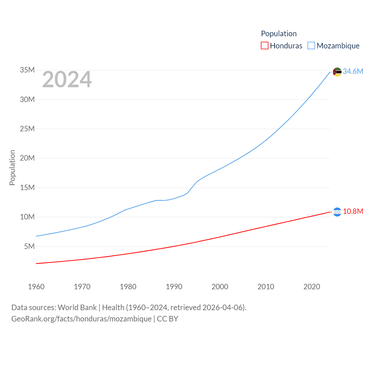 Honduras has a population of 10.8M (ranked 89/197), compared with 34.6M in Mozambique (ranked 46/197). Honduras' land area is 43,201 sq mi versus 303,623 sq mi for Mozambique (ranked 100th vs. 34th).