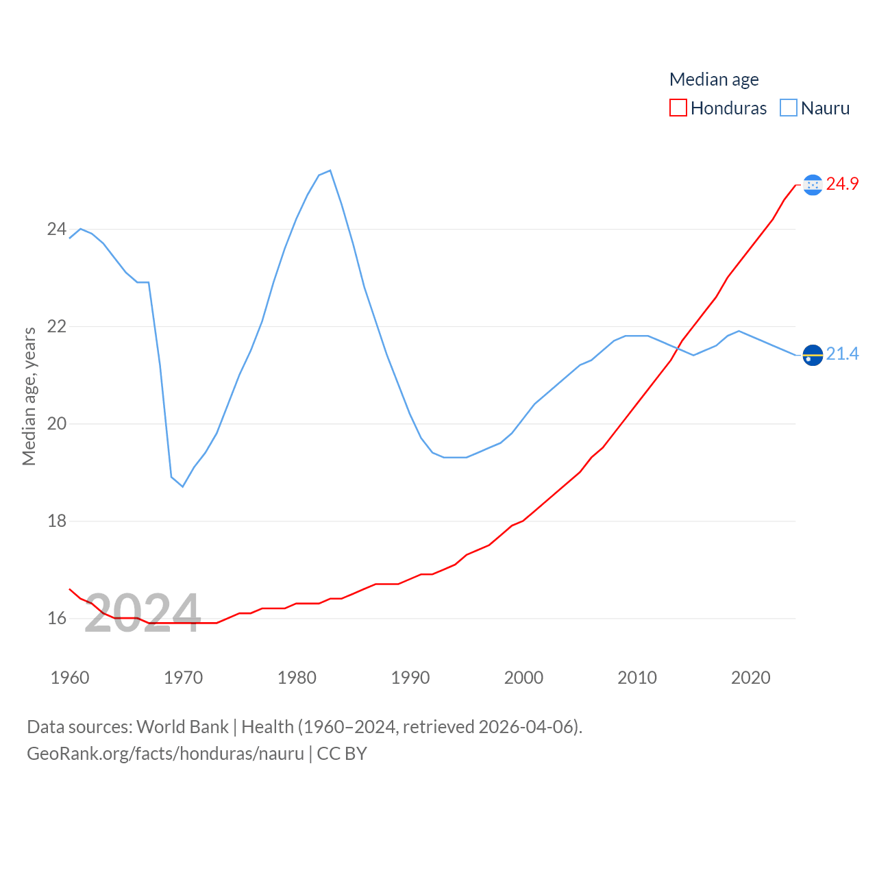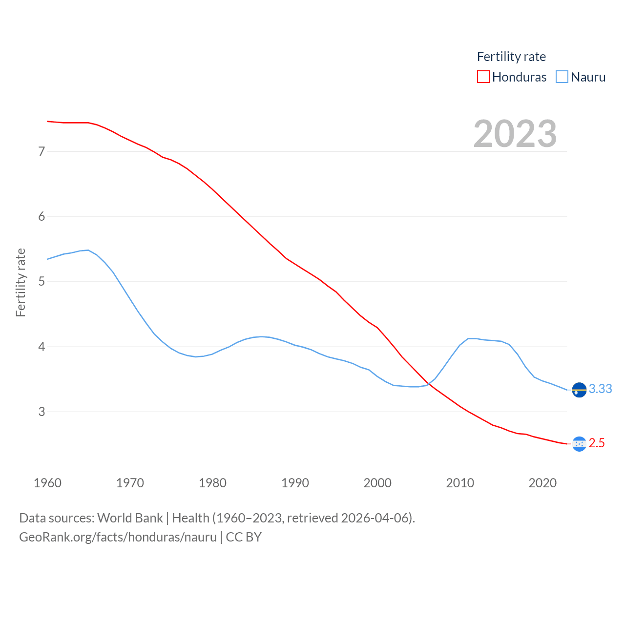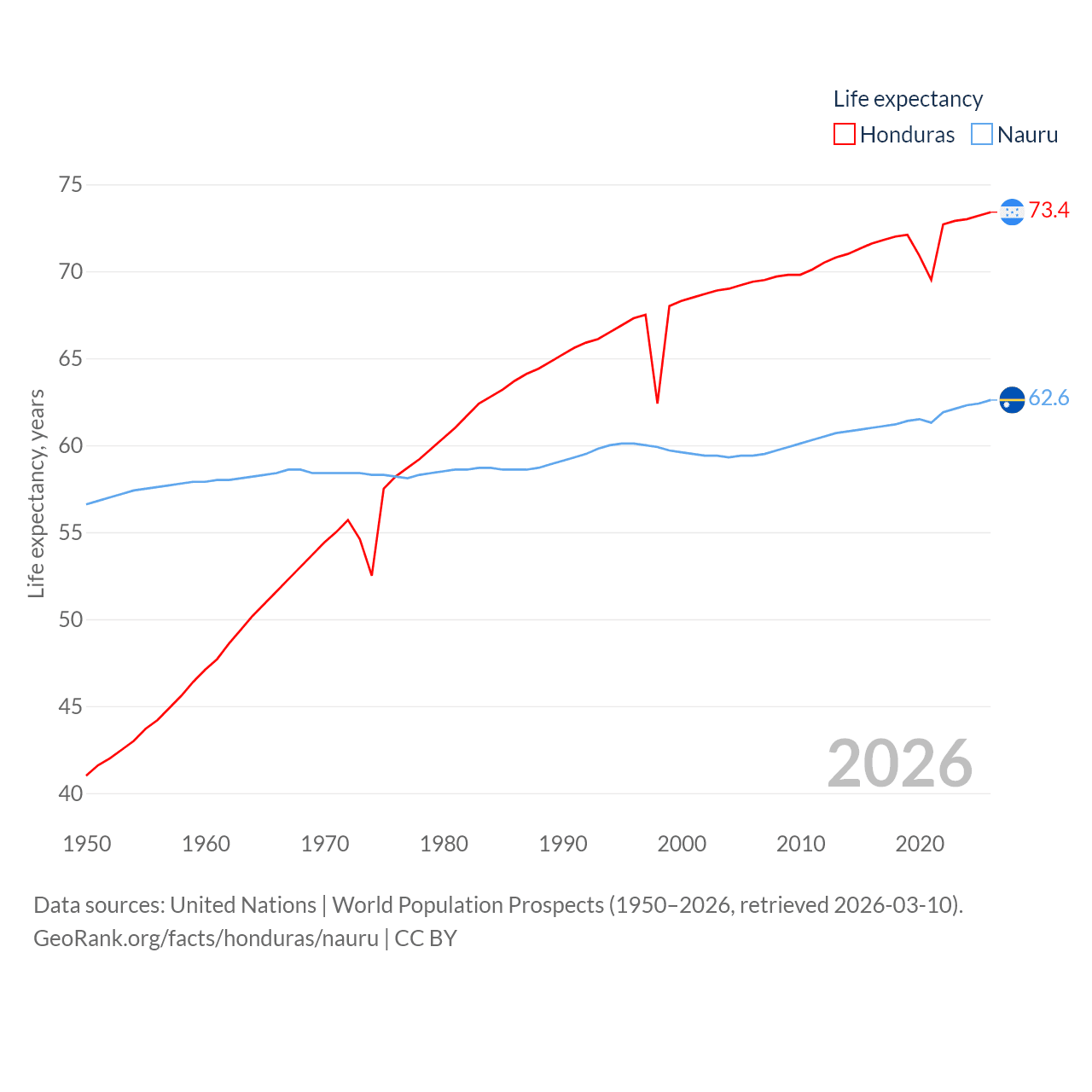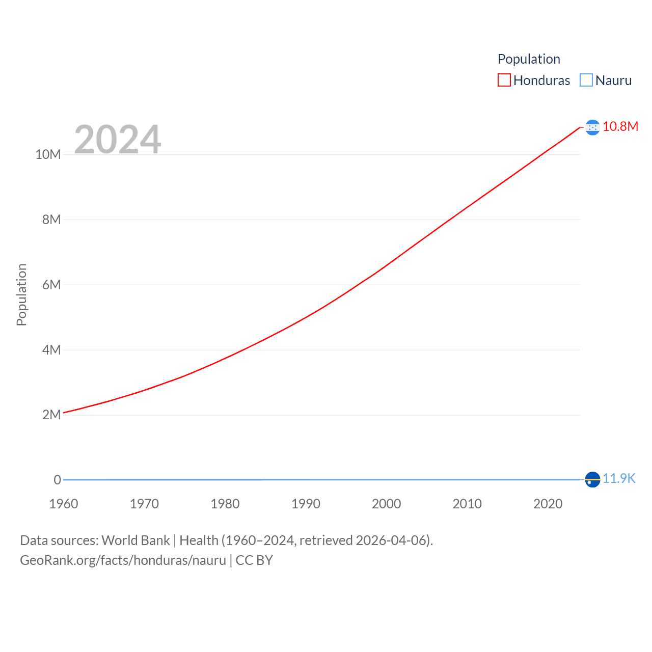 Honduras has a population of 10.8M (ranked 89/197), compared with 11.9K in Nauru (ranked 195/197). Honduras' land area is 43,201 sq mi versus 7.72 sq mi for Nauru (ranked 100th vs. 195th).
