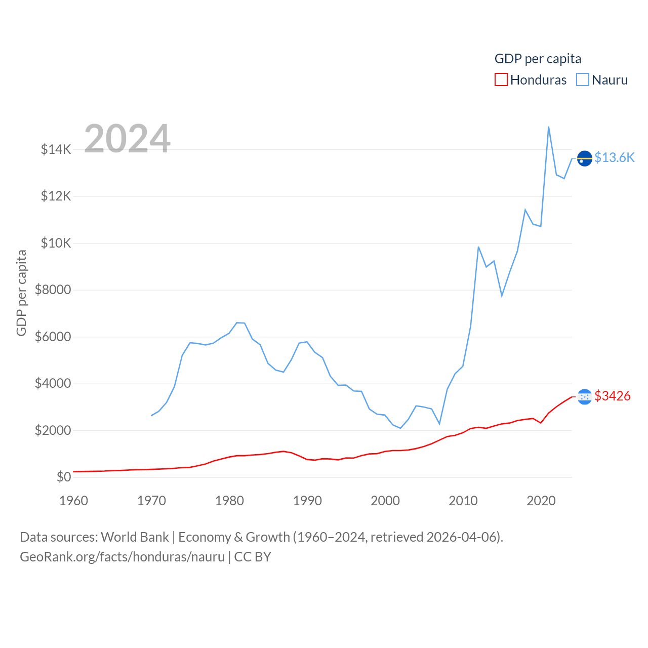 By GDP, Honduras ranks 104/197 ($37.1B) and Nauru ranks 195/197 ($163M). By GDP per capita, Honduras ranks 136/197 ($3,426), while Nauru ranks 74/197 ($13,609).
