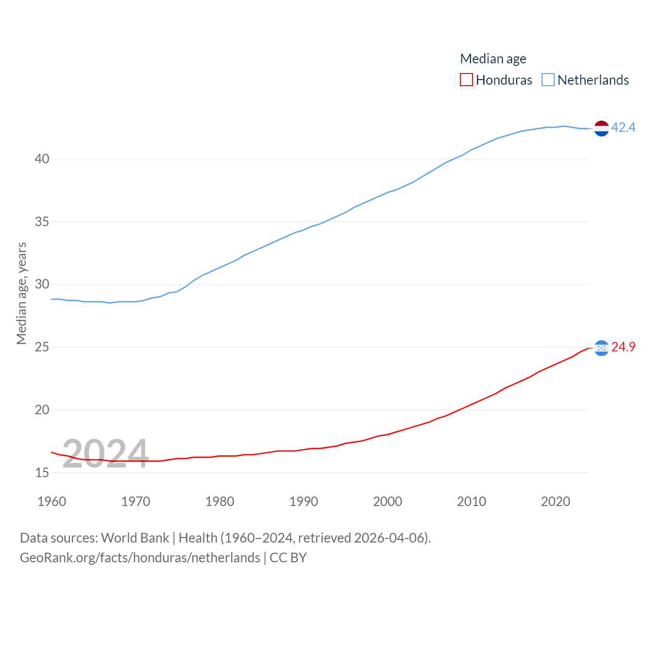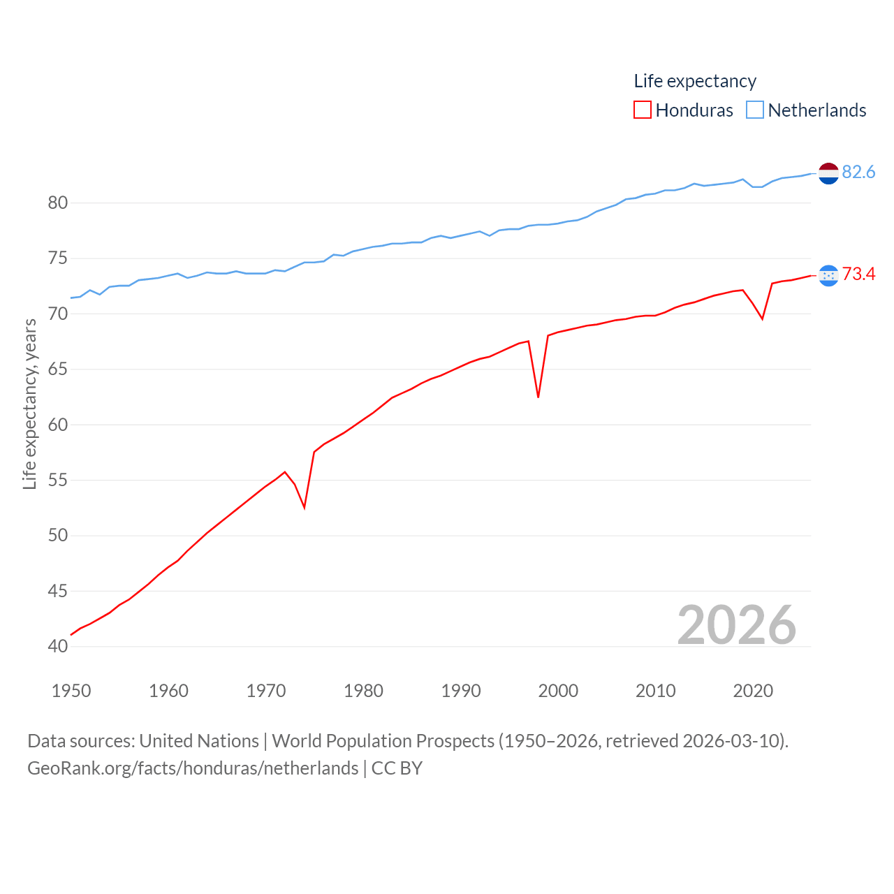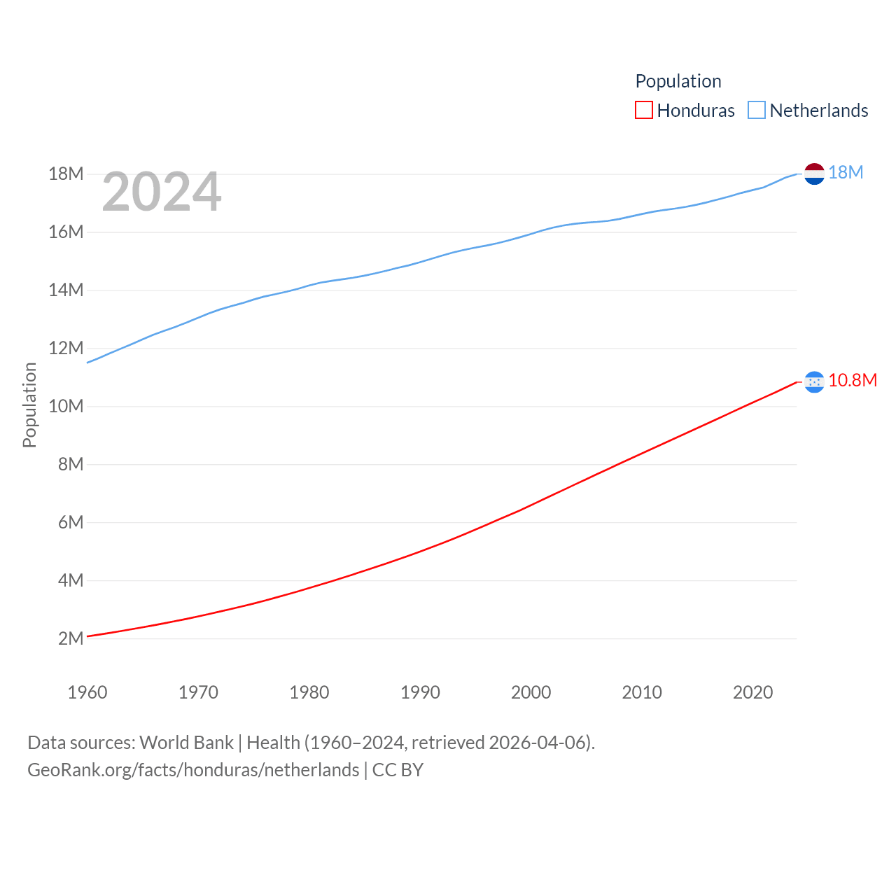 Honduras has a population of 10.8M (ranked 89/197), compared with 18M in The Netherlands (ranked 72/197). Honduras' land area is 43,201 sq mi versus 13,000 sq mi for The Netherlands (ranked 100th vs. 134th).