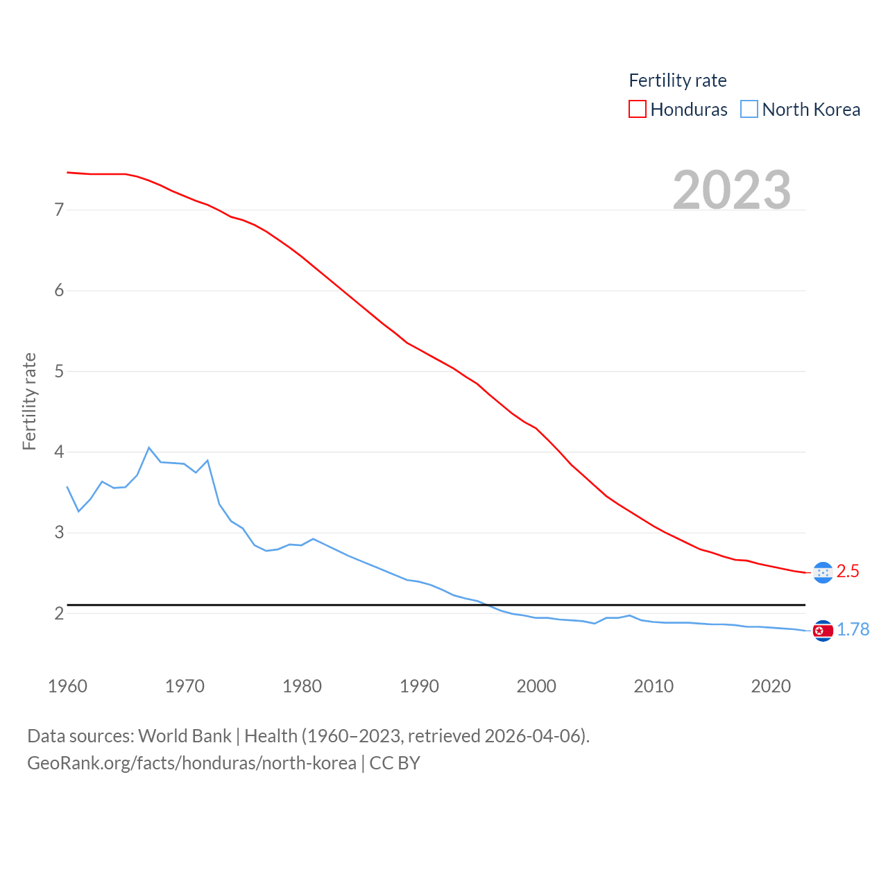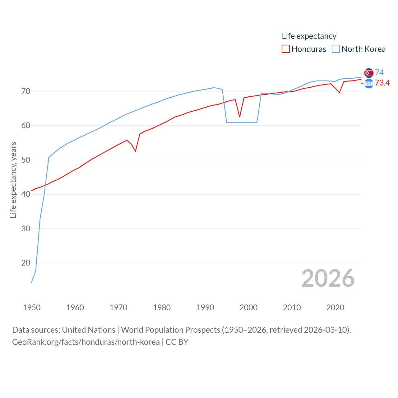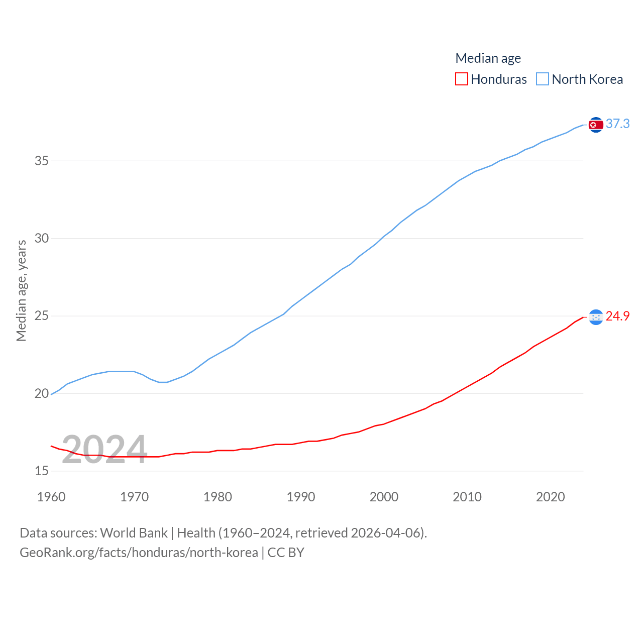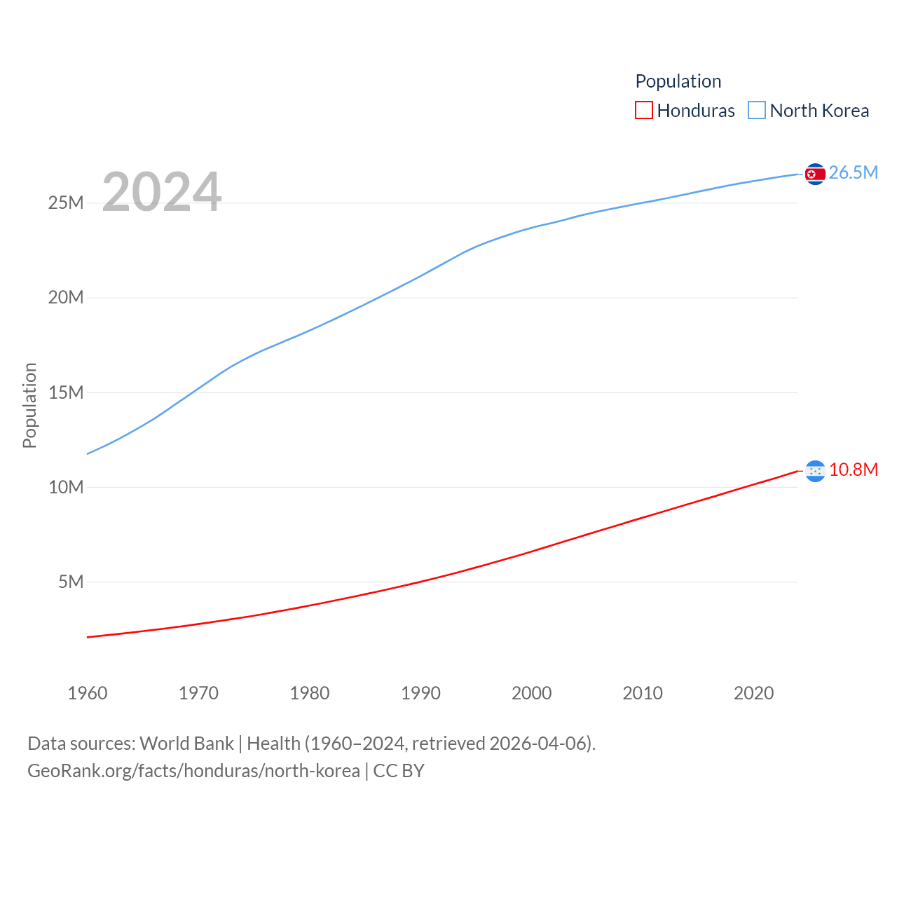Honduras has a population of 10.8M (ranked 89/197), compared with 26.5M in North Korea (ranked 56/197). Honduras' land area is 43,201 sq mi versus 46,491 sq mi for North Korea (ranked 100th vs. 97th).
