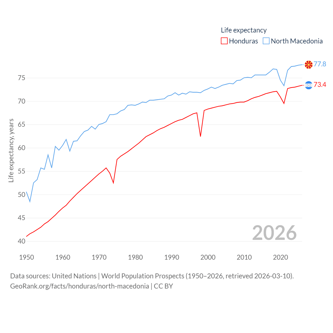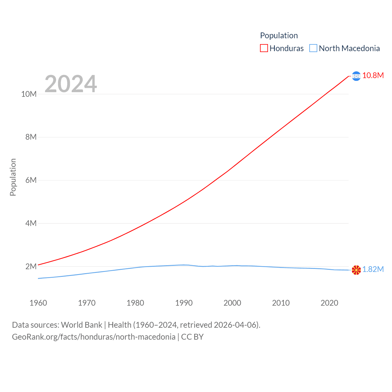 Honduras has a population of 10.8M (ranked 89/197), compared with 1.82M in North Macedonia (ranked 150/197). Honduras' land area is 43,201 sq mi versus 9,737 sq mi for North Macedonia (ranked 100th vs. 145th).