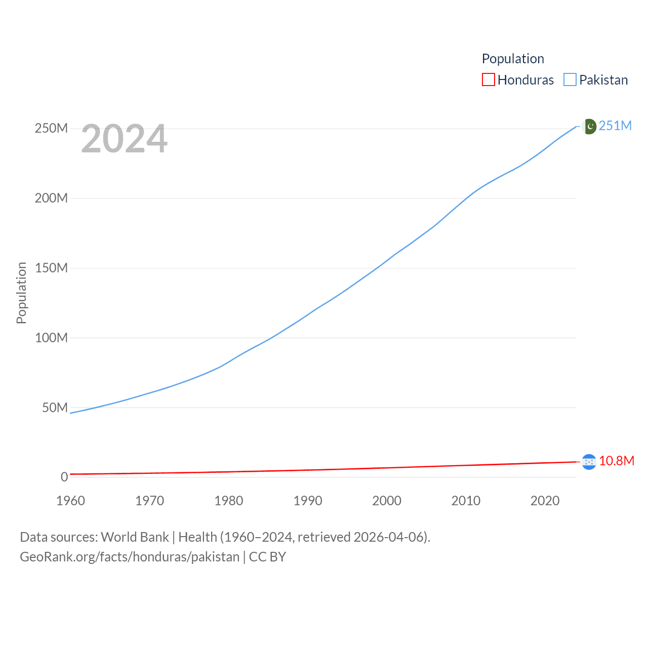 Honduras has a population of 10.8M (ranked 89/197), compared with 251M in Pakistan (ranked 5/197). Honduras' land area is 43,201 sq mi versus 297,638 sq mi for Pakistan (ranked 100th vs. 35th).