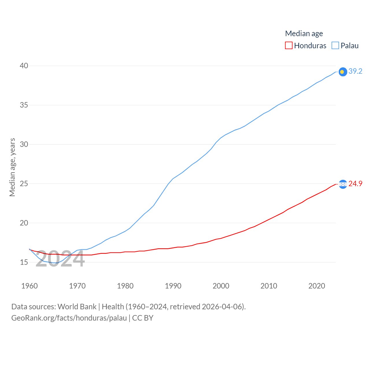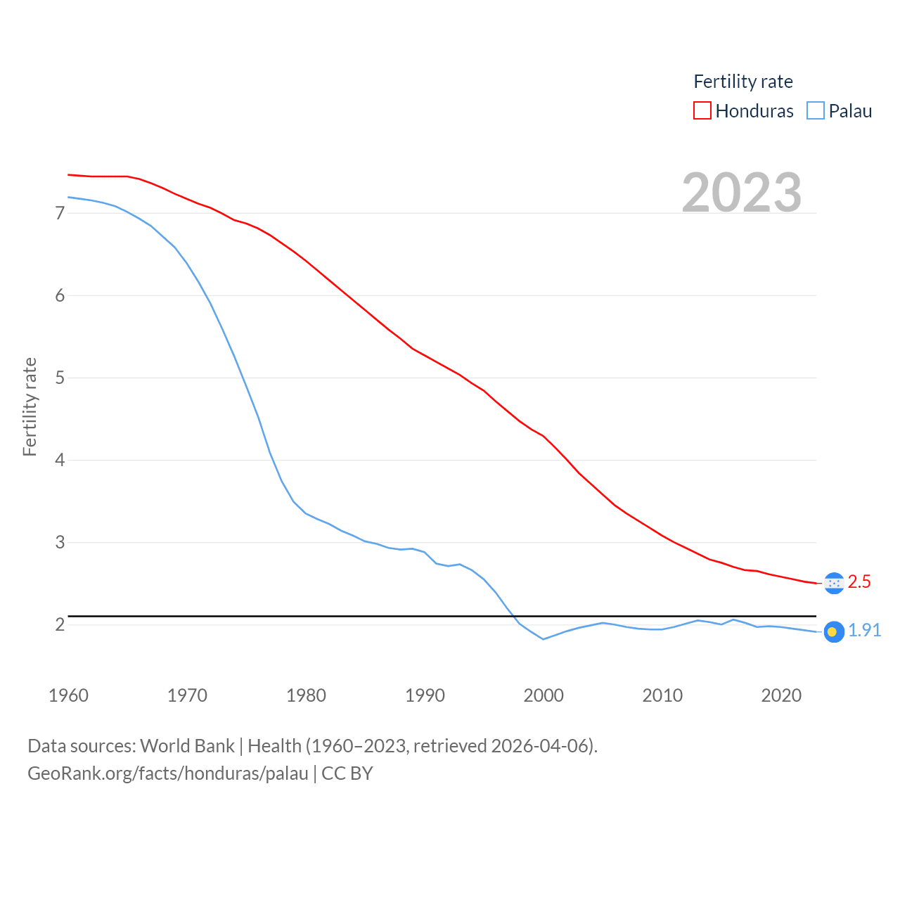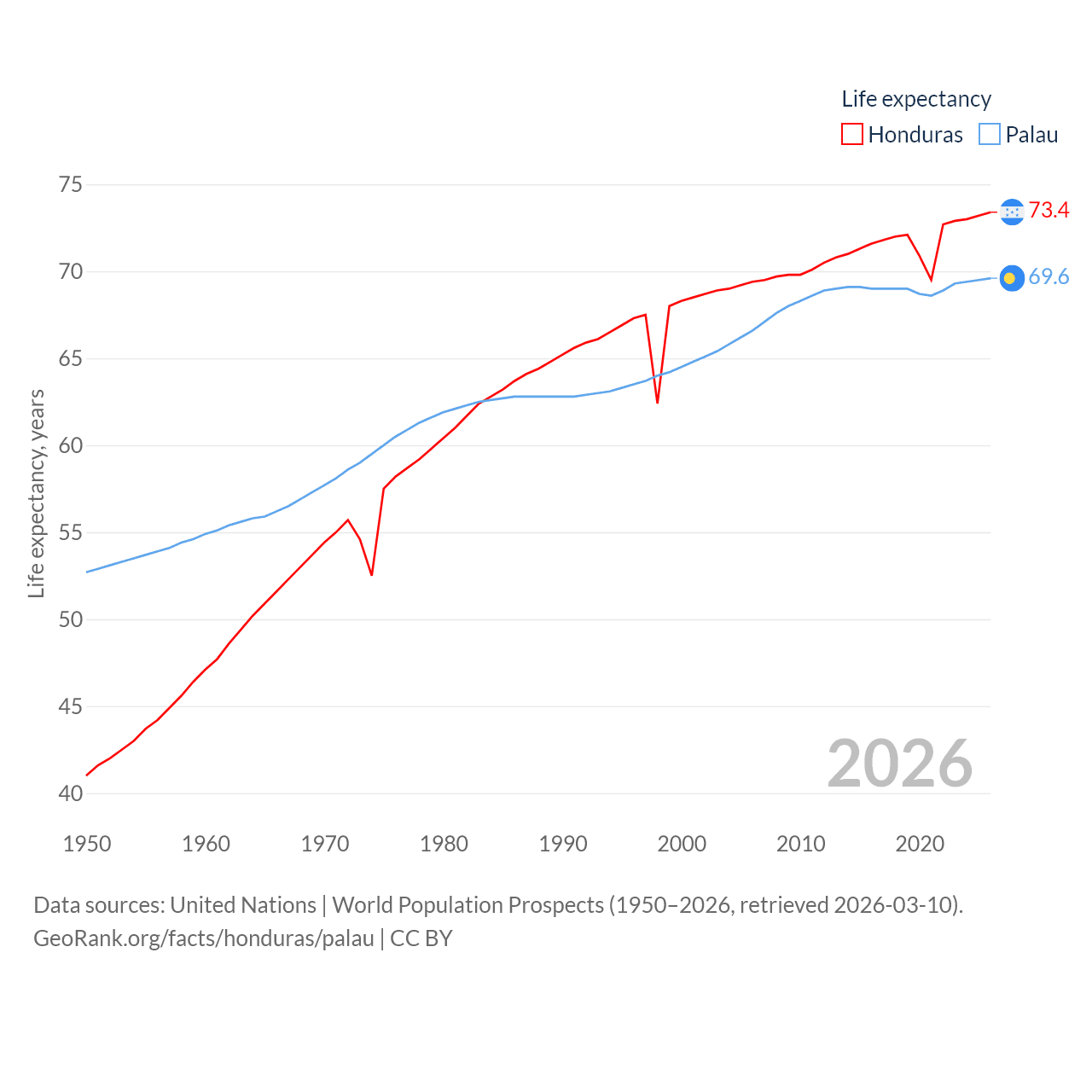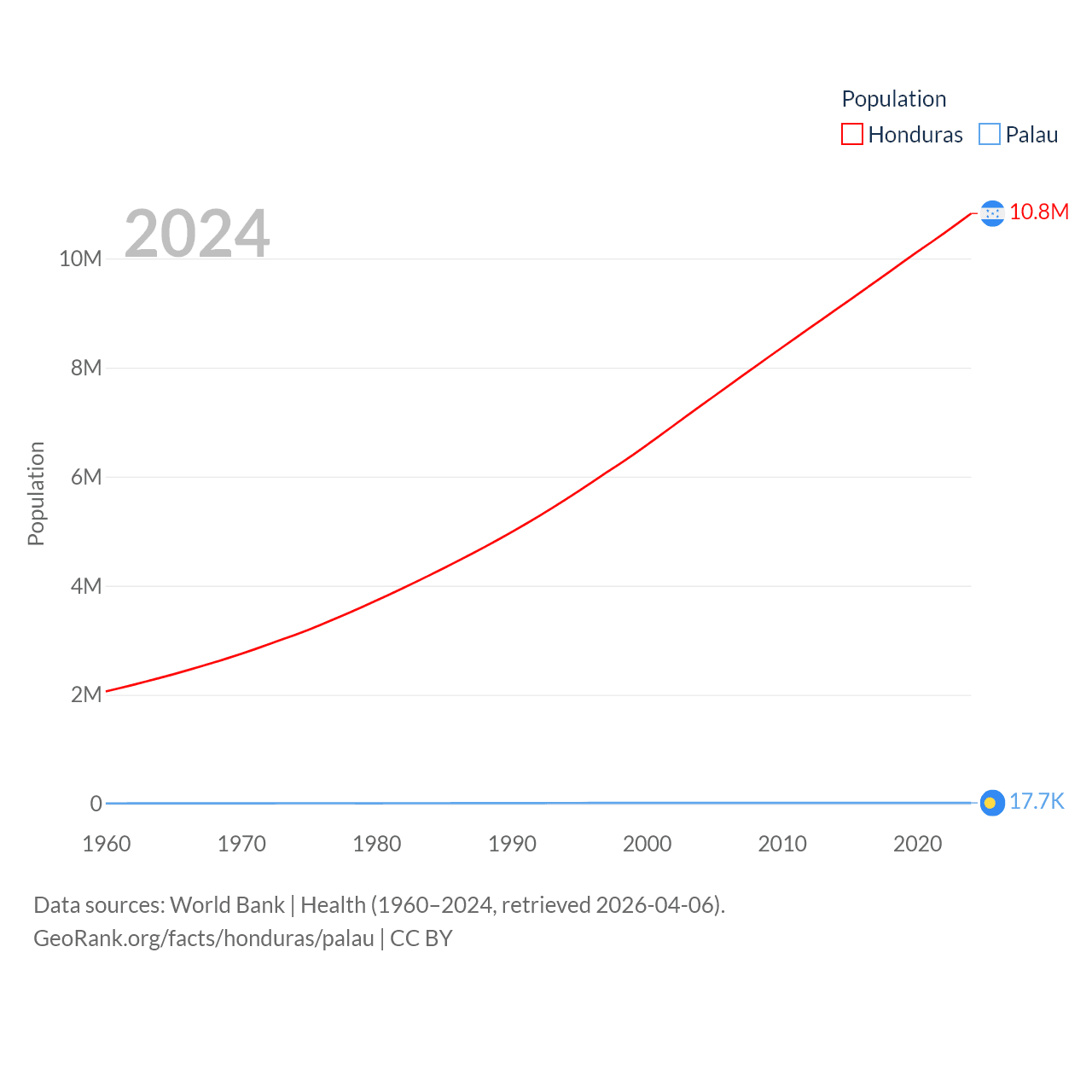 Honduras has a population of 10.8M (ranked 89/197), compared with 17.7K in Palau (ranked 194/197). Honduras' land area is 43,201 sq mi versus 177.6 sq mi for Palau (ranked 100th vs. 180th).