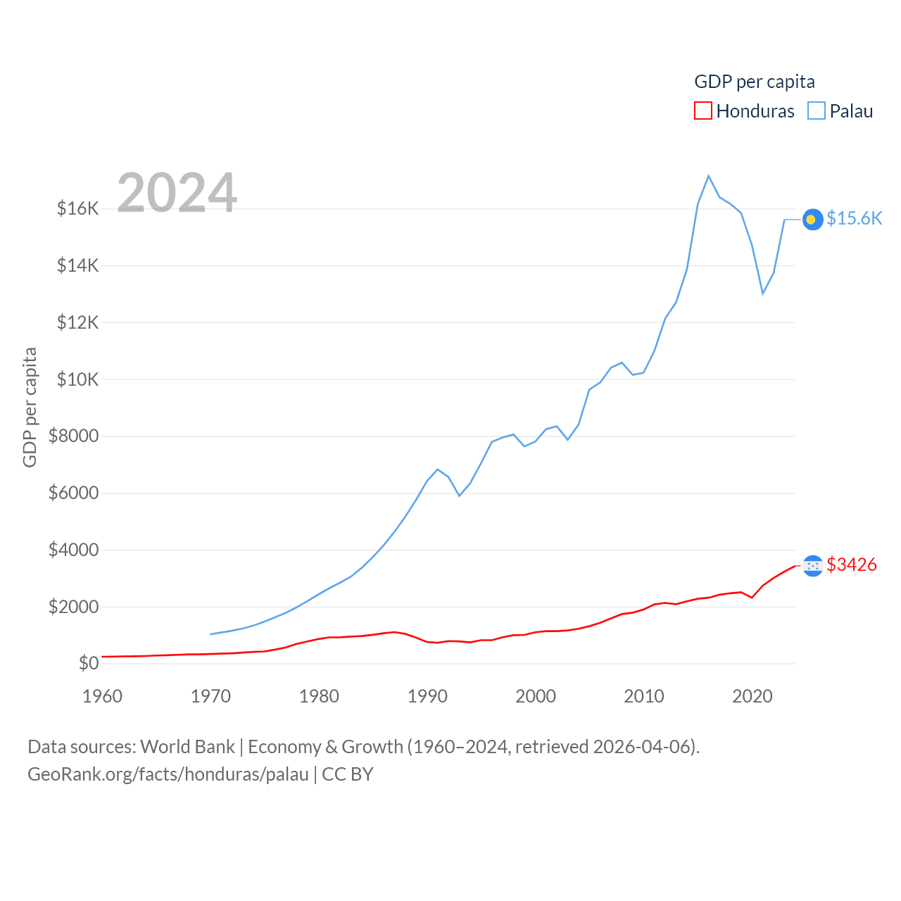 By GDP, Honduras ranks 104/197 ($37.1B) and Palau ranks 194/197 ($277M). By GDP per capita, Honduras ranks 136/197 ($3,426), while Palau ranks 67/197 ($15,611).