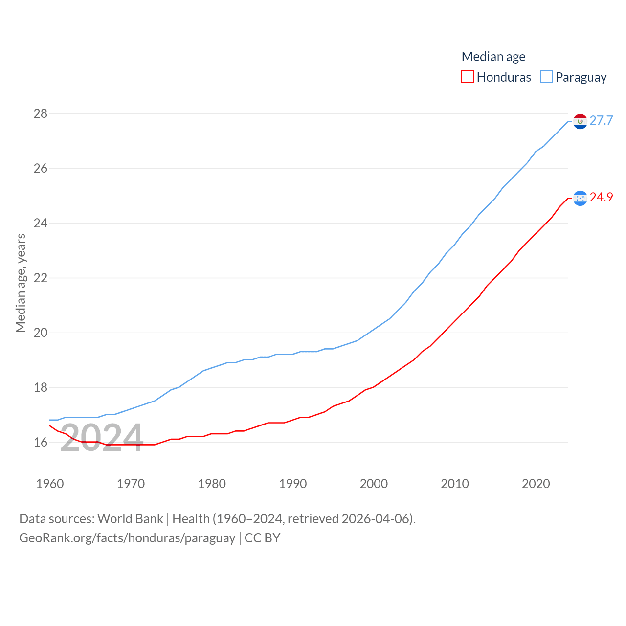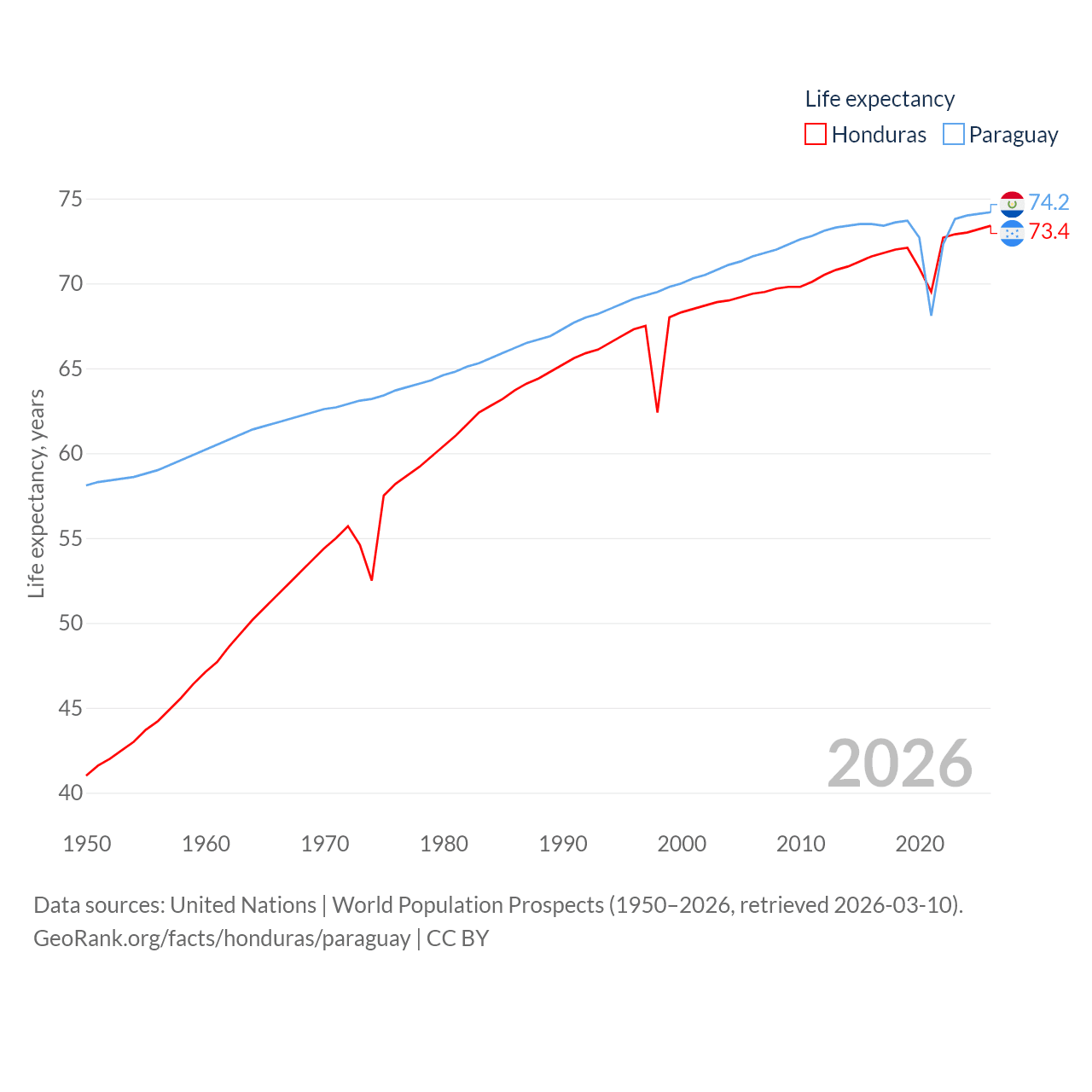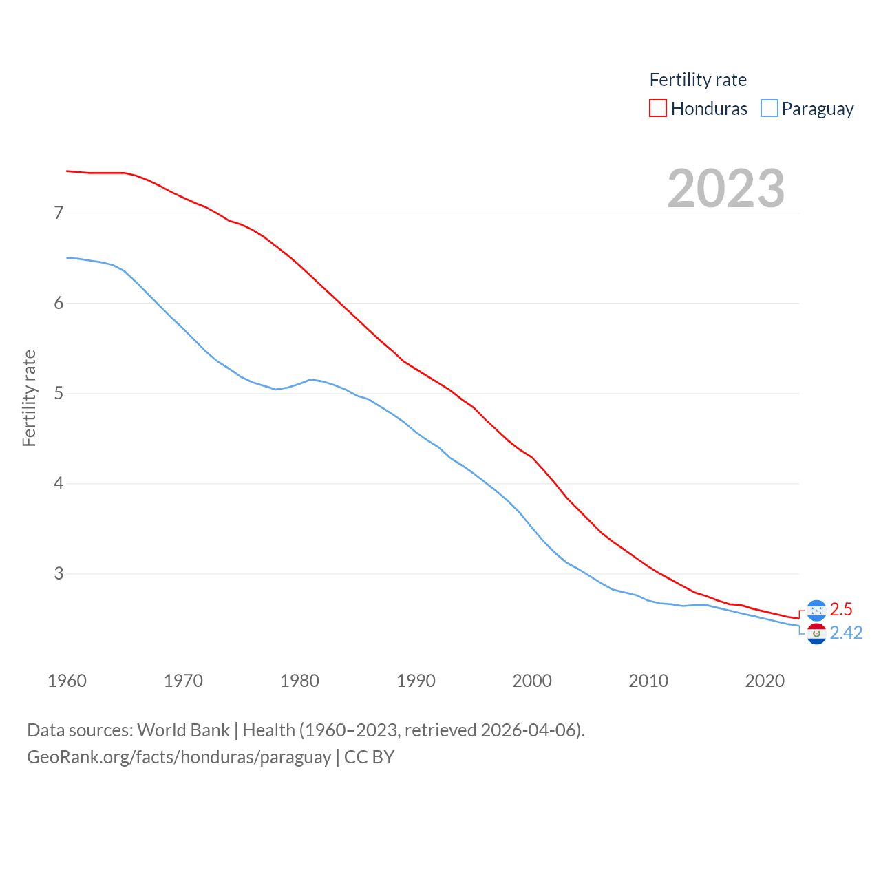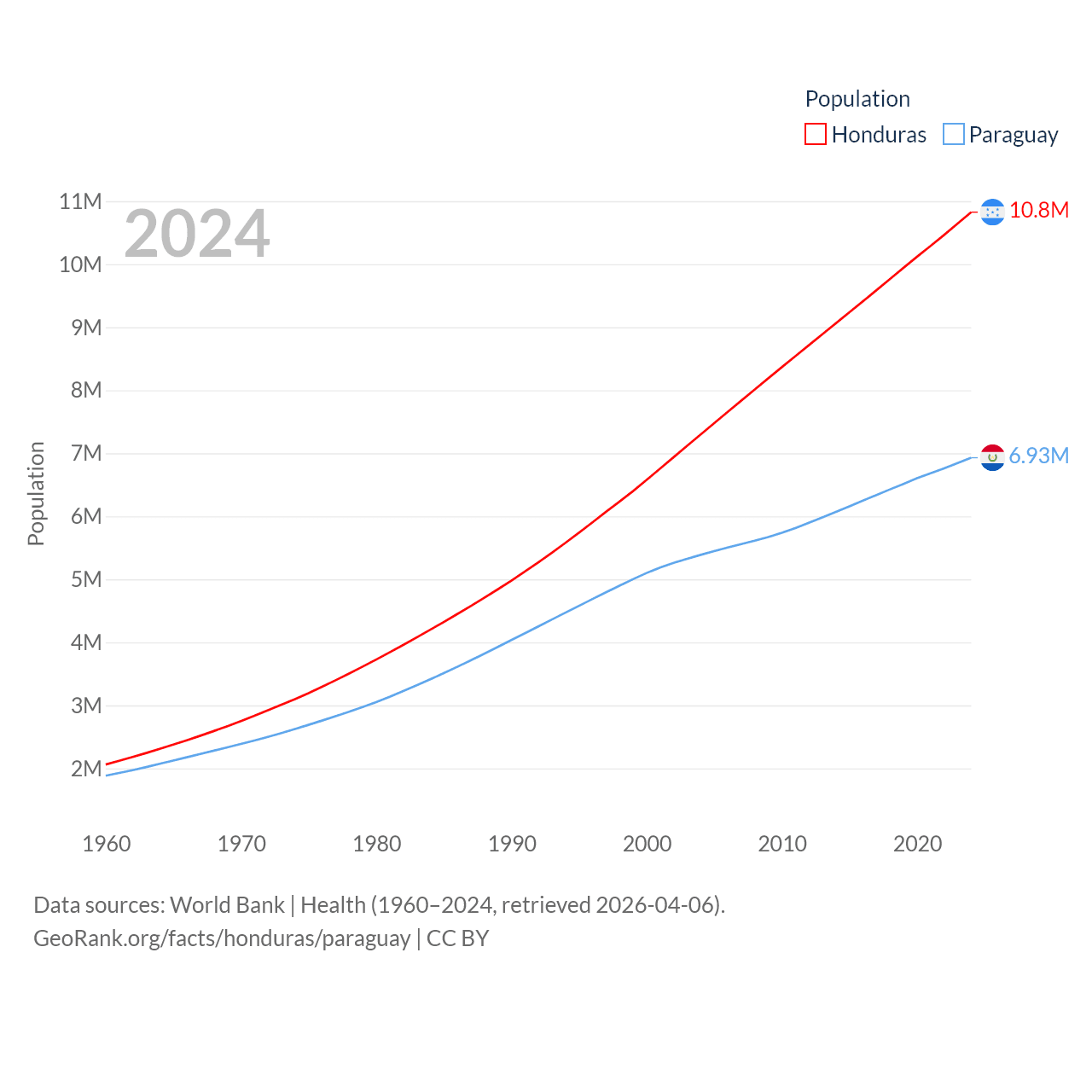 Honduras has a population of 10.8M (ranked 89/197), compared with 6.93M in Paraguay (ranked 107/197). Honduras' land area is 43,201 sq mi versus 152,901 sq mi for Paraguay (ranked 100th vs. 59th).