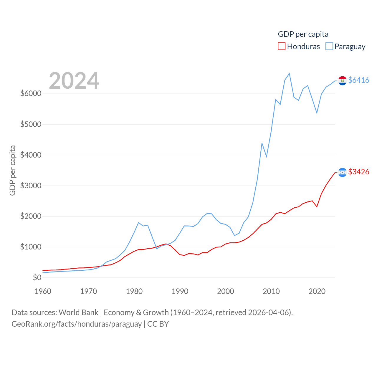 By GDP, Honduras ranks 104/197 ($37.1B) and Paraguay ranks 98/197 ($44.5B). By GDP per capita, Honduras ranks 136/197 ($3,426), while Paraguay ranks 109/197 ($6,416).