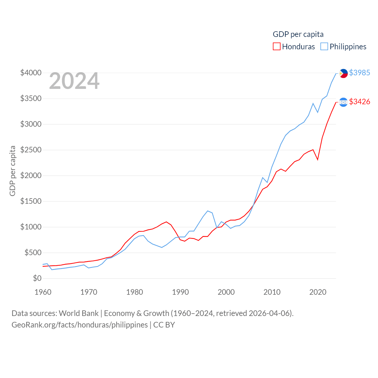 By GDP, Honduras ranks 104/197 ($37.1B) and The Philippines ranks 35/197 ($462B). By GDP per capita, Honduras ranks 136/197 ($3,426), while The Philippines ranks 130/197 ($3,985).