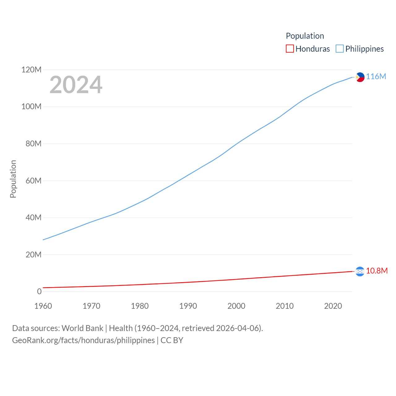 Honduras has a population of 10.8M (ranked 89/197), compared with 116M in The Philippines (ranked 14/197). Honduras' land area is 43,201 sq mi versus 115,124 sq mi for The Philippines (ranked 100th vs. 71st).
