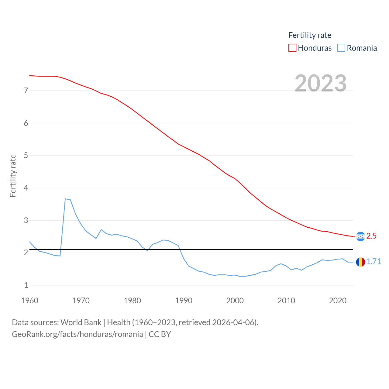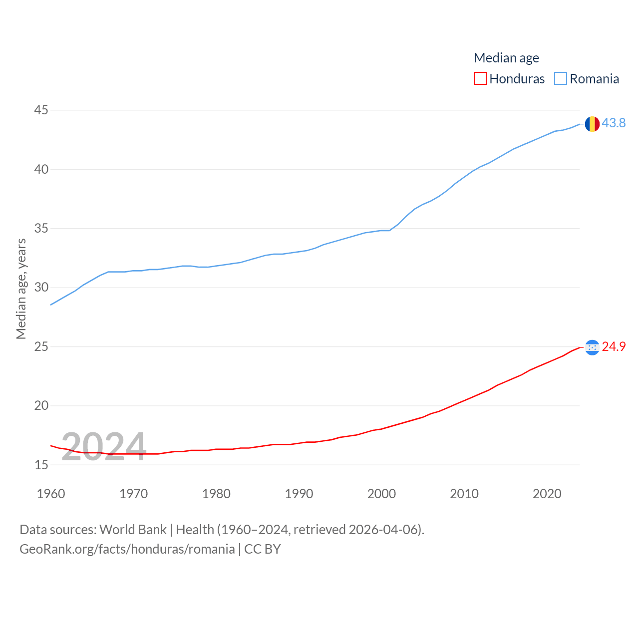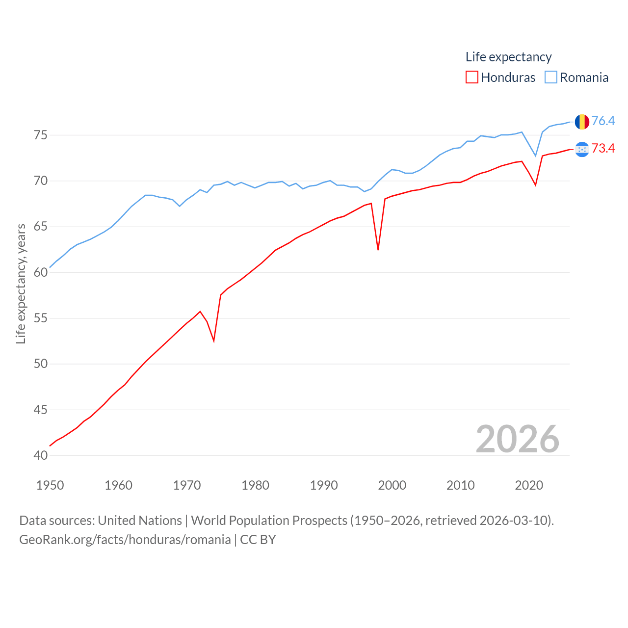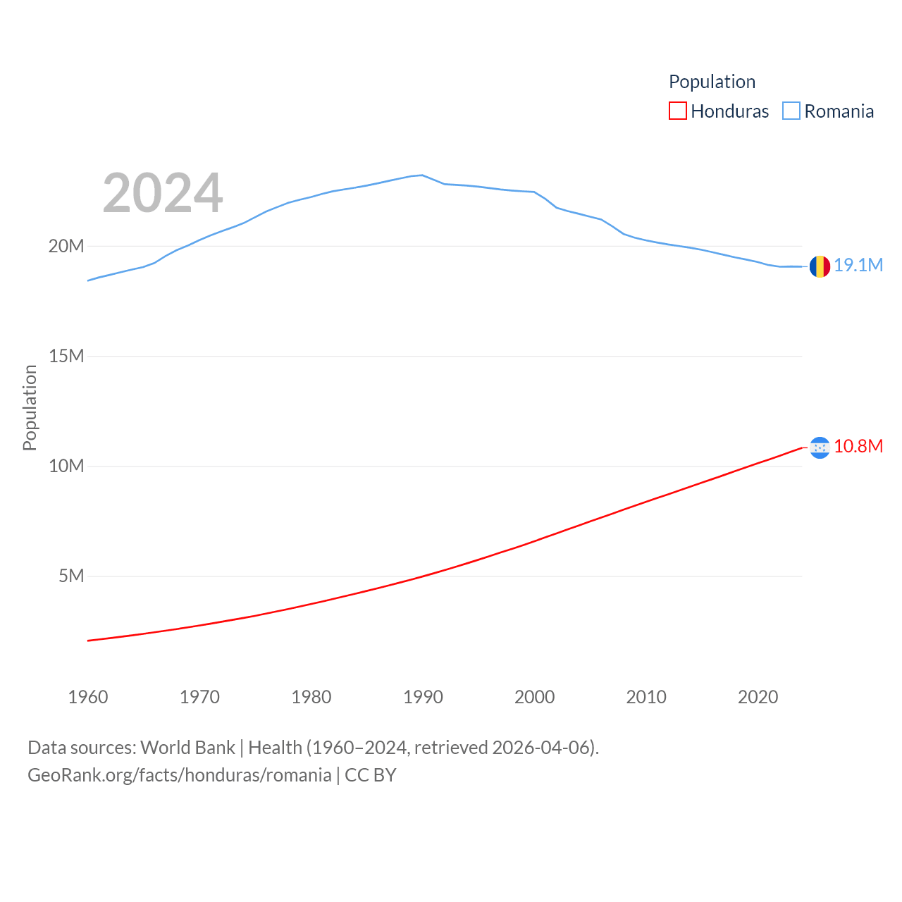 Honduras has a population of 10.8M (ranked 89/197), compared with 19.1M in Romania (ranked 67/197). Honduras' land area is 43,201 sq mi versus 88,834 sq mi for Romania (ranked 100th vs. 80th).