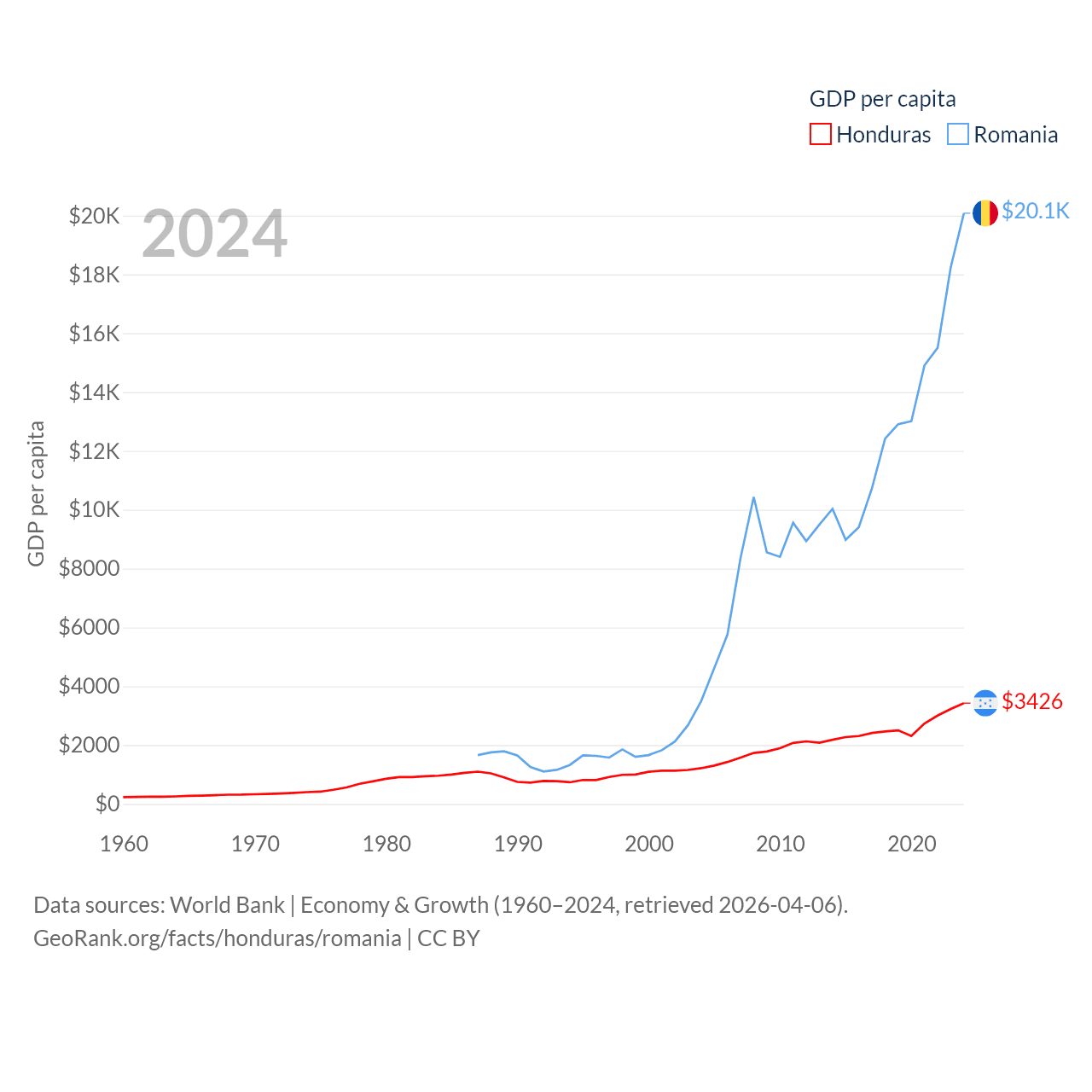 By GDP, Honduras ranks 104/197 ($37.1B) and Romania ranks 42/197 ($383B). By GDP per capita, Honduras ranks 136/197 ($3,426), while Romania ranks 58/197 ($20,080).
