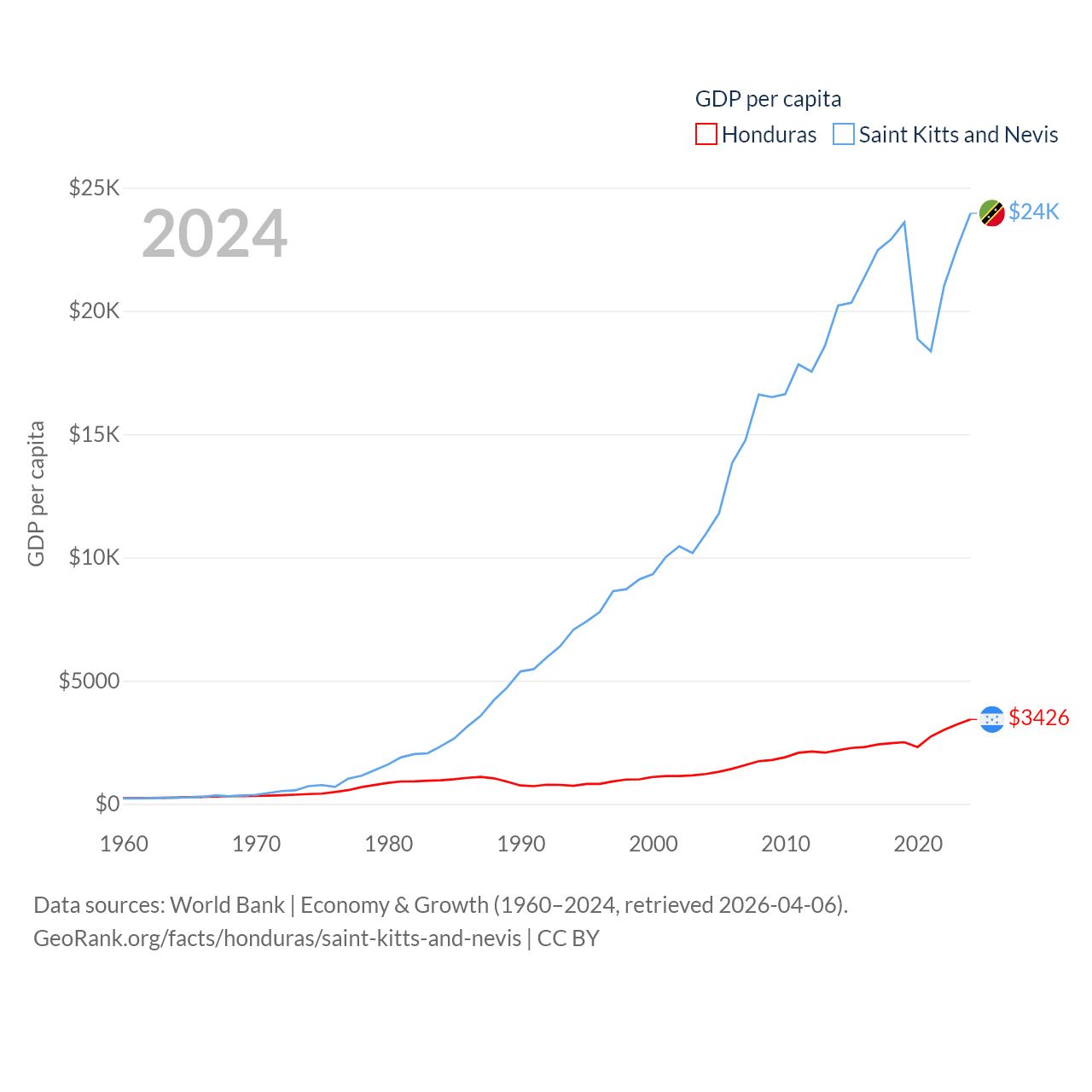 By GDP, Honduras ranks 104/197 ($37.1B) and Saint Kitts and Nevis ranks 187/197 ($1.12B). By GDP per capita, Honduras ranks 136/197 ($3,426), while Saint Kitts and Nevis ranks 51/197 ($23,961).