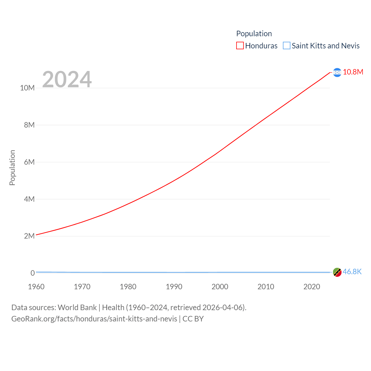 Honduras has a population of 10.8M (ranked 89/197), compared with 46.8K in Saint Kitts and Nevis (ranked 189/197). Honduras' land area is 43,201 sq mi versus 100.4 sq mi for Saint Kitts and Nevis (ranked 100th vs. 189th).