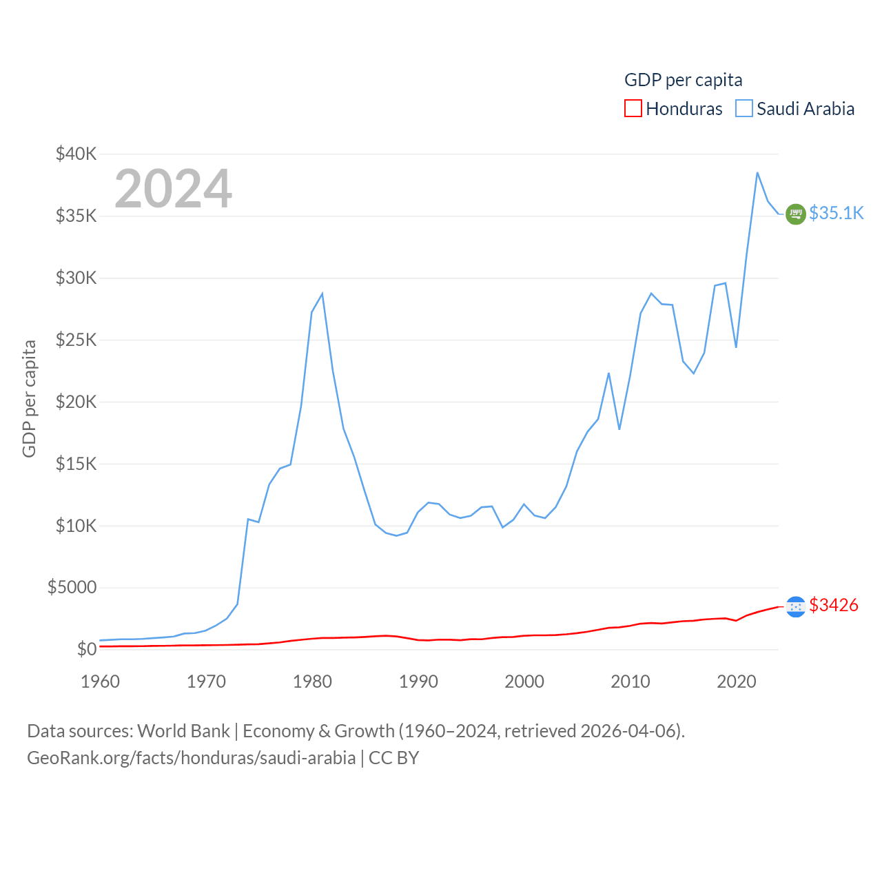 By GDP, Honduras ranks 104/197 ($37.1B) and Saudi Arabia ranks 18/197 ($1.24T). By GDP per capita, Honduras ranks 136/197 ($3,426), while Saudi Arabia ranks 33/197 ($35,122).