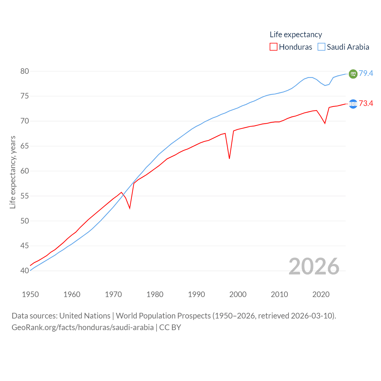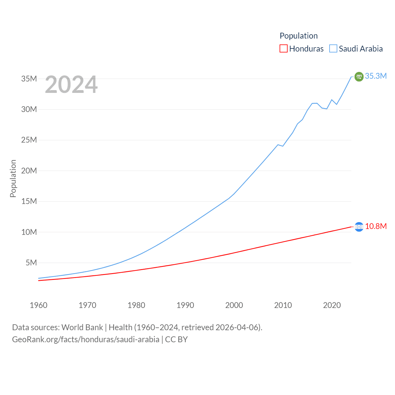 Honduras has a population of 10.8M (ranked 89/197), compared with 35.3M in Saudi Arabia (ranked 45/197). Honduras' land area is 43,201 sq mi versus 830,000 sq mi for Saudi Arabia (ranked 100th vs. 12th).