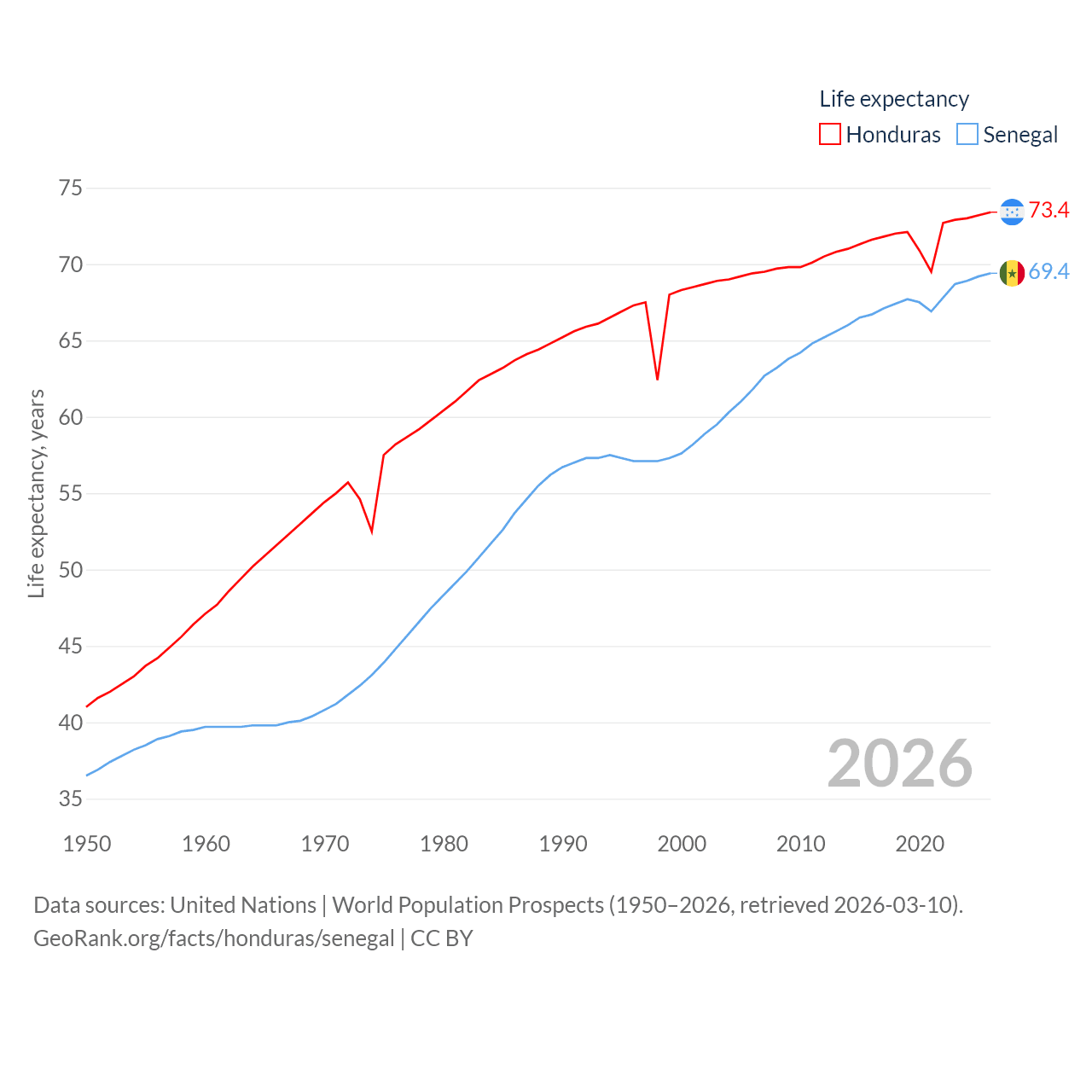 Honduras has a population of 10.8M (ranked 89/197), compared with 18.5M in Senegal (ranked 69/197). Honduras' land area is 43,201 sq mi versus 74,336 sq mi for Senegal (ranked 100th vs. 85th).