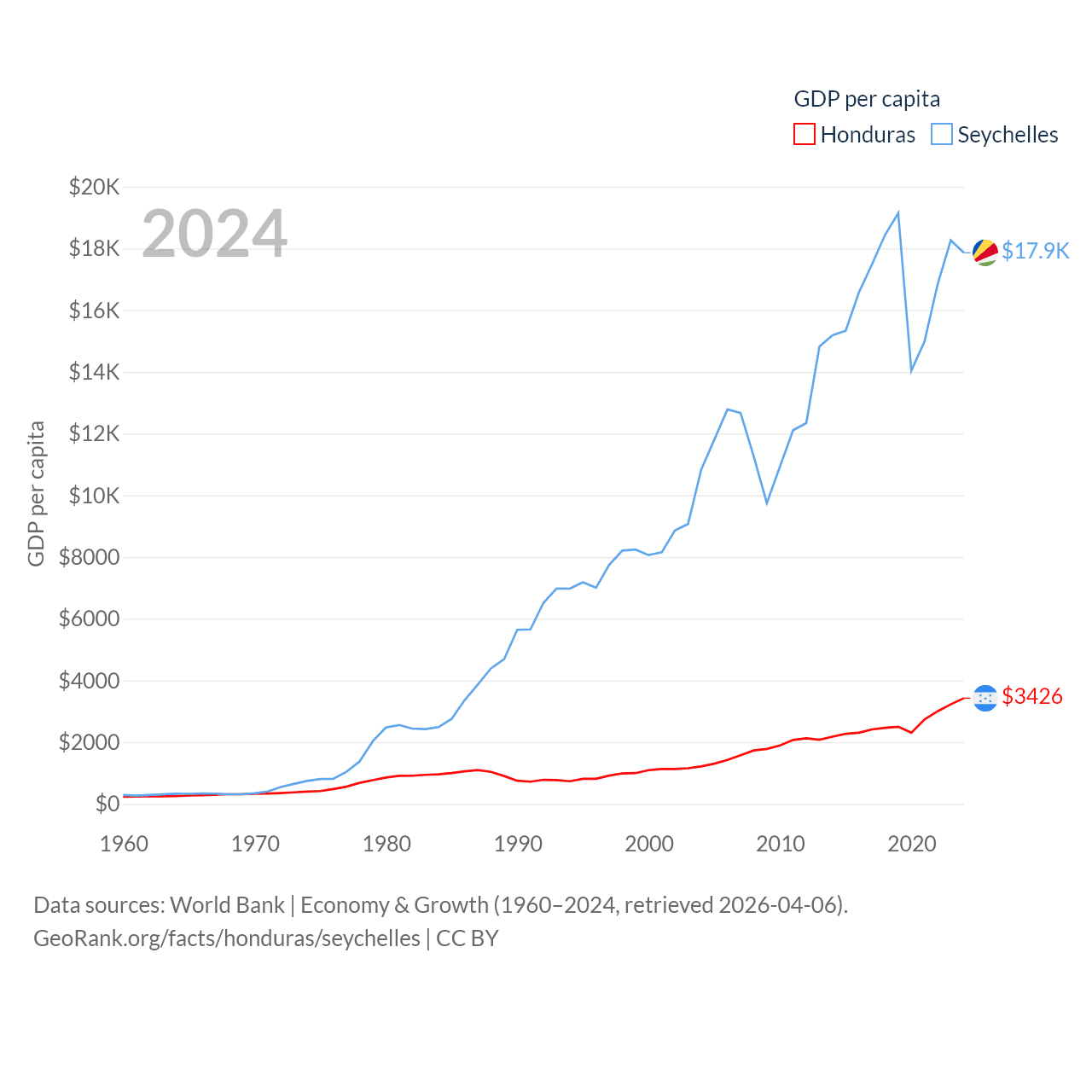 By GDP, Honduras ranks 104/197 ($37.1B) and The Seychelles ranks 178/197 ($2.17B). By GDP per capita, Honduras ranks 136/197 ($3,426), while The Seychelles ranks 63/197 ($17,859).