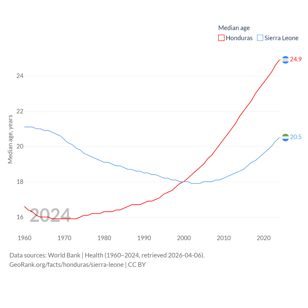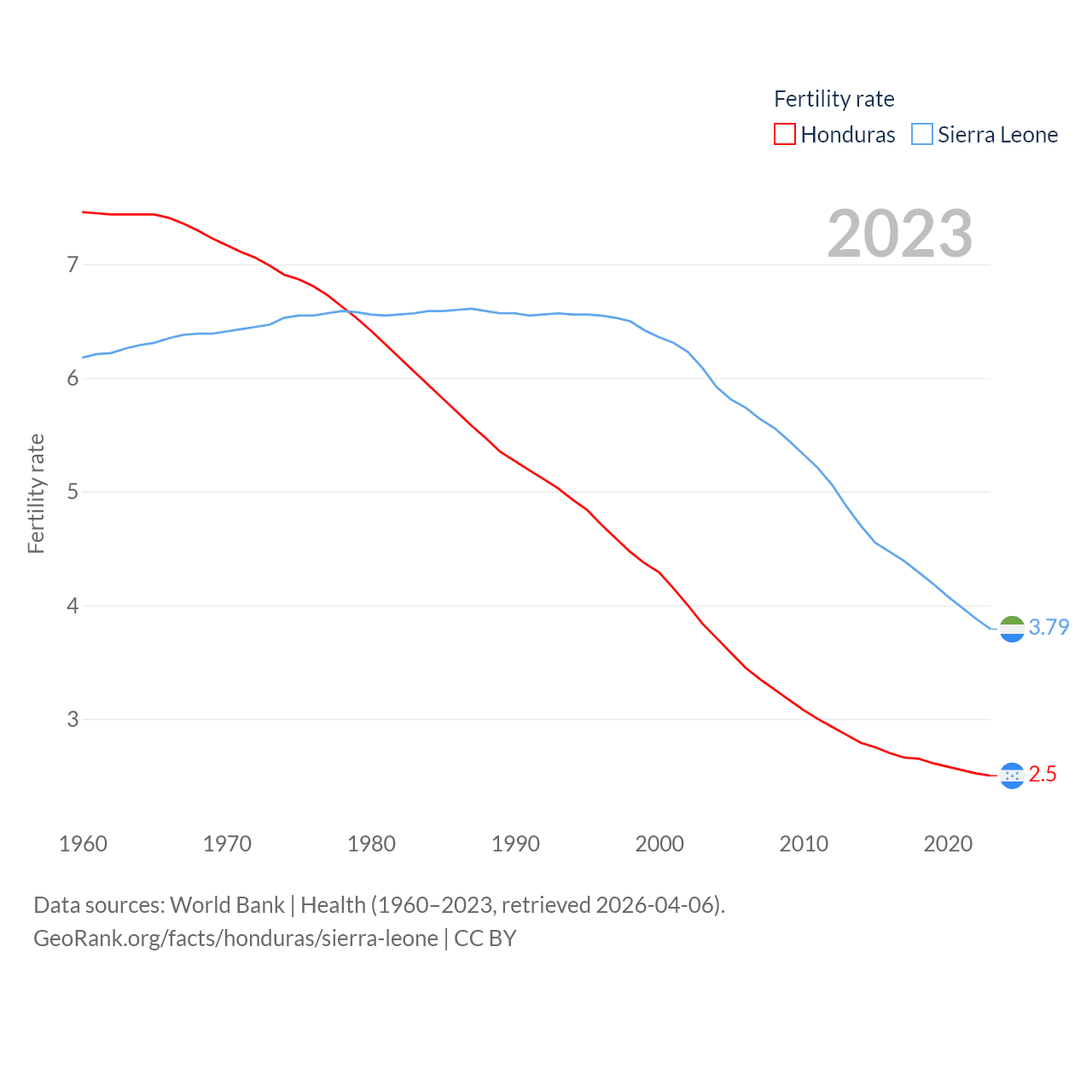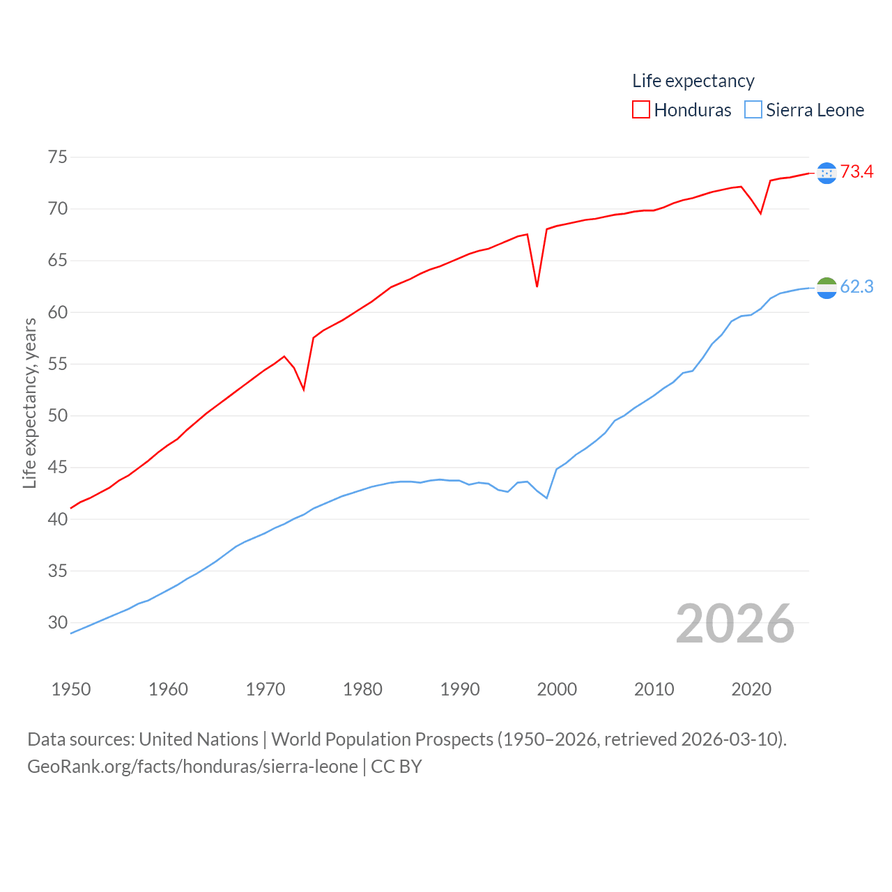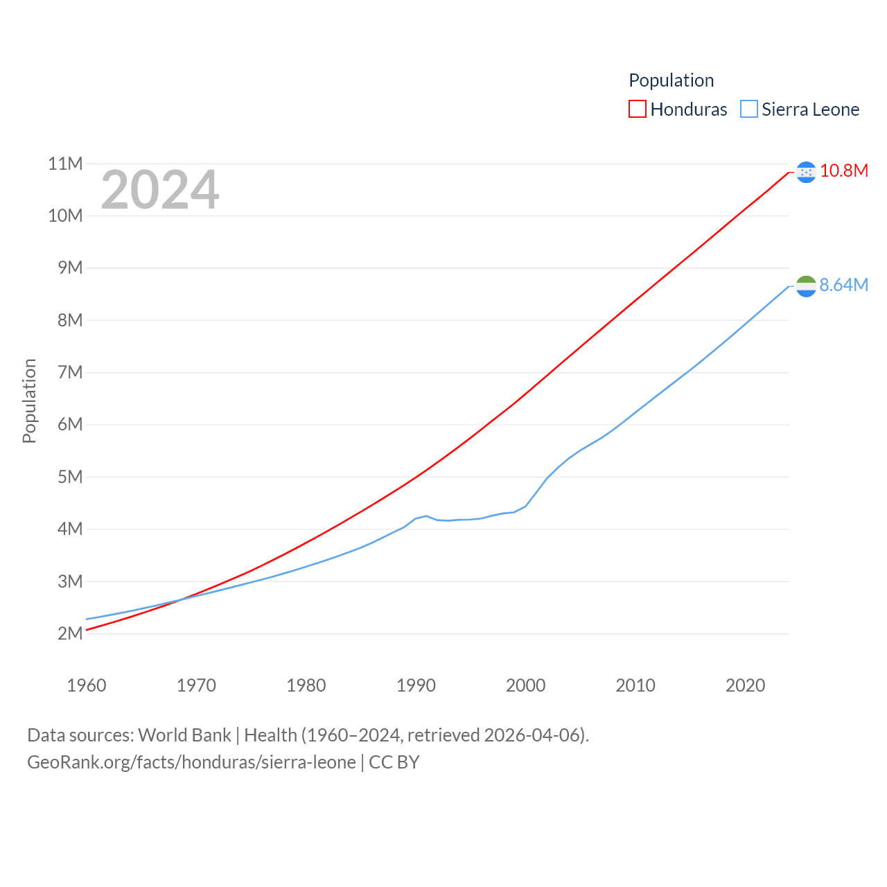 Honduras has a population of 10.8M (ranked 89/197), compared with 8.64M in Sierra Leone (ranked 102/197). Honduras' land area is 43,201 sq mi versus 27,869 sq mi for Sierra Leone (ranked 100th vs. 116th).