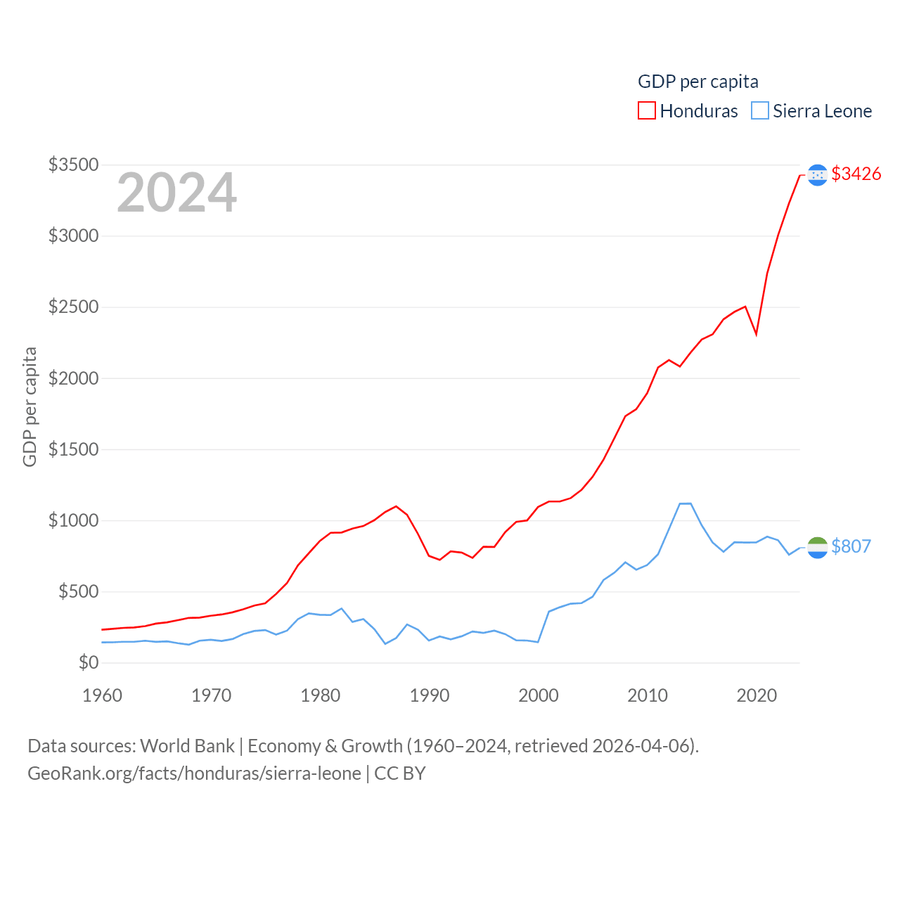 By GDP, Honduras ranks 104/197 ($37.1B) and Sierra Leone ranks 160/197 ($6.97B). By GDP per capita, Honduras ranks 136/197 ($3,426), while Sierra Leone ranks 186/197 ($807).