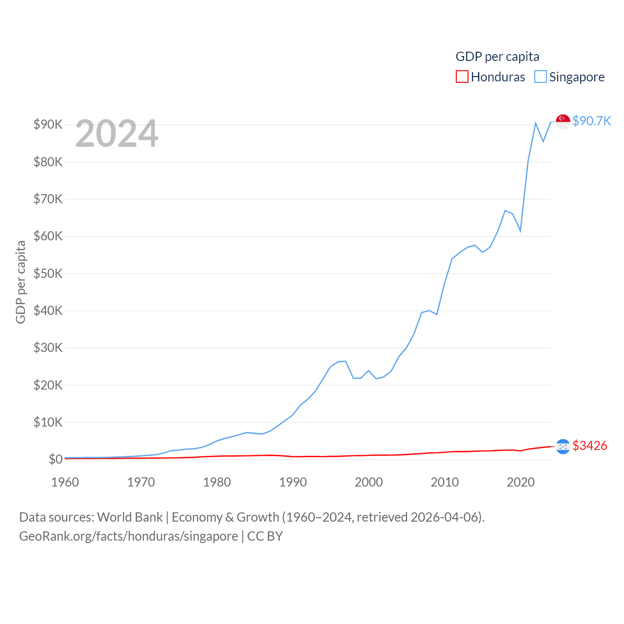 By GDP, Honduras ranks 104/197 ($37.1B) and Singapore ranks 28/197 ($547B). By GDP per capita, Honduras ranks 136/197 ($3,426), while Singapore ranks 7/197 ($90,674).