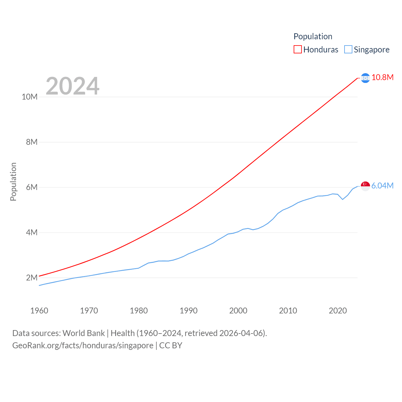 Honduras has a population of 10.8M (ranked 89/197), compared with 6.04M in Singapore (ranked 113/197). Honduras' land area is 43,201 sq mi versus 277.2 sq mi for Singapore (ranked 100th vs. 177th).