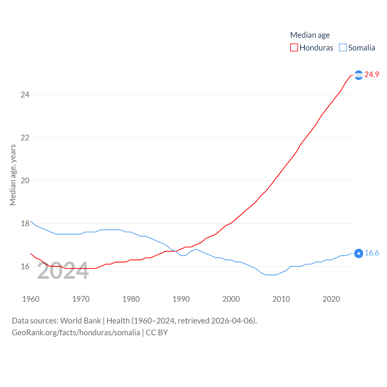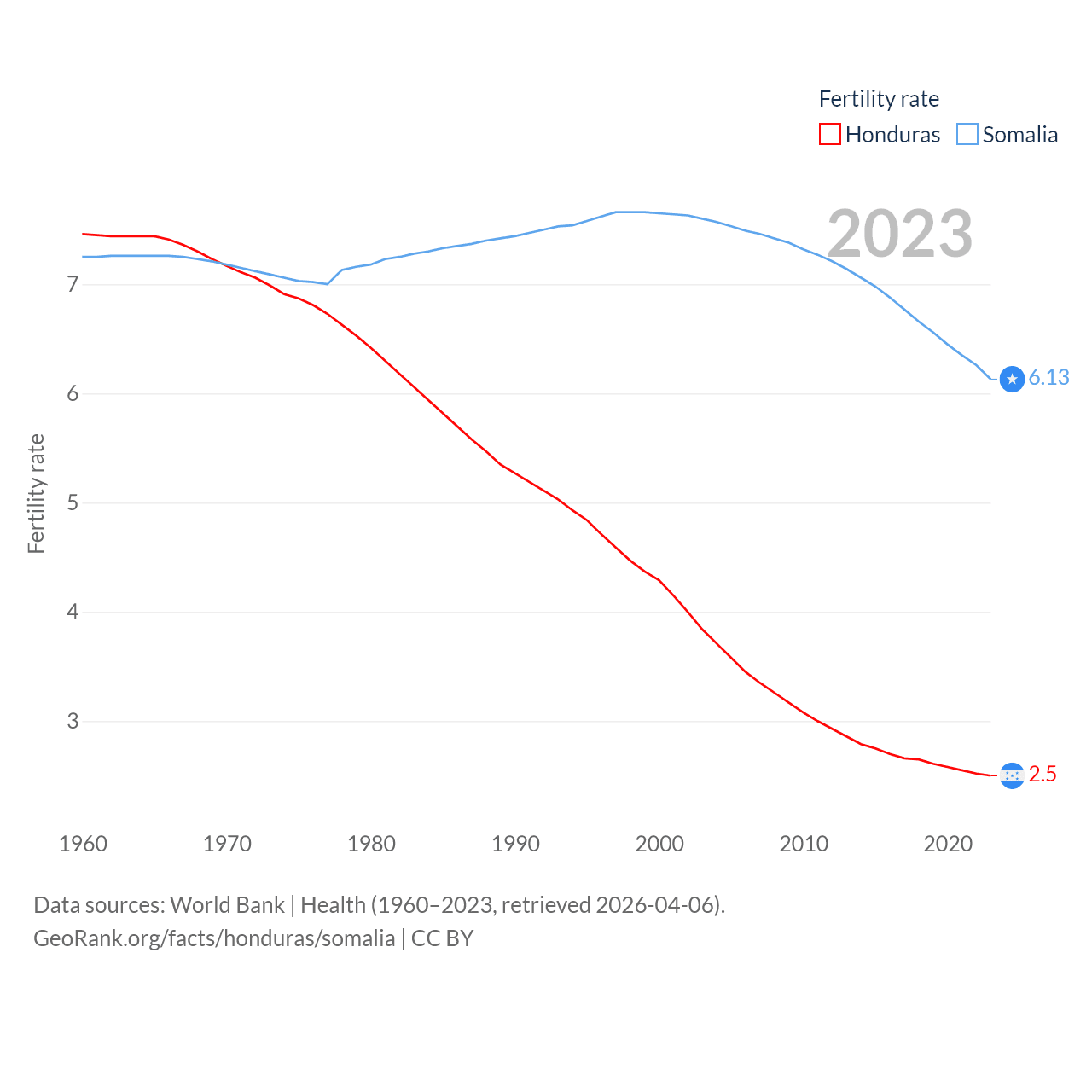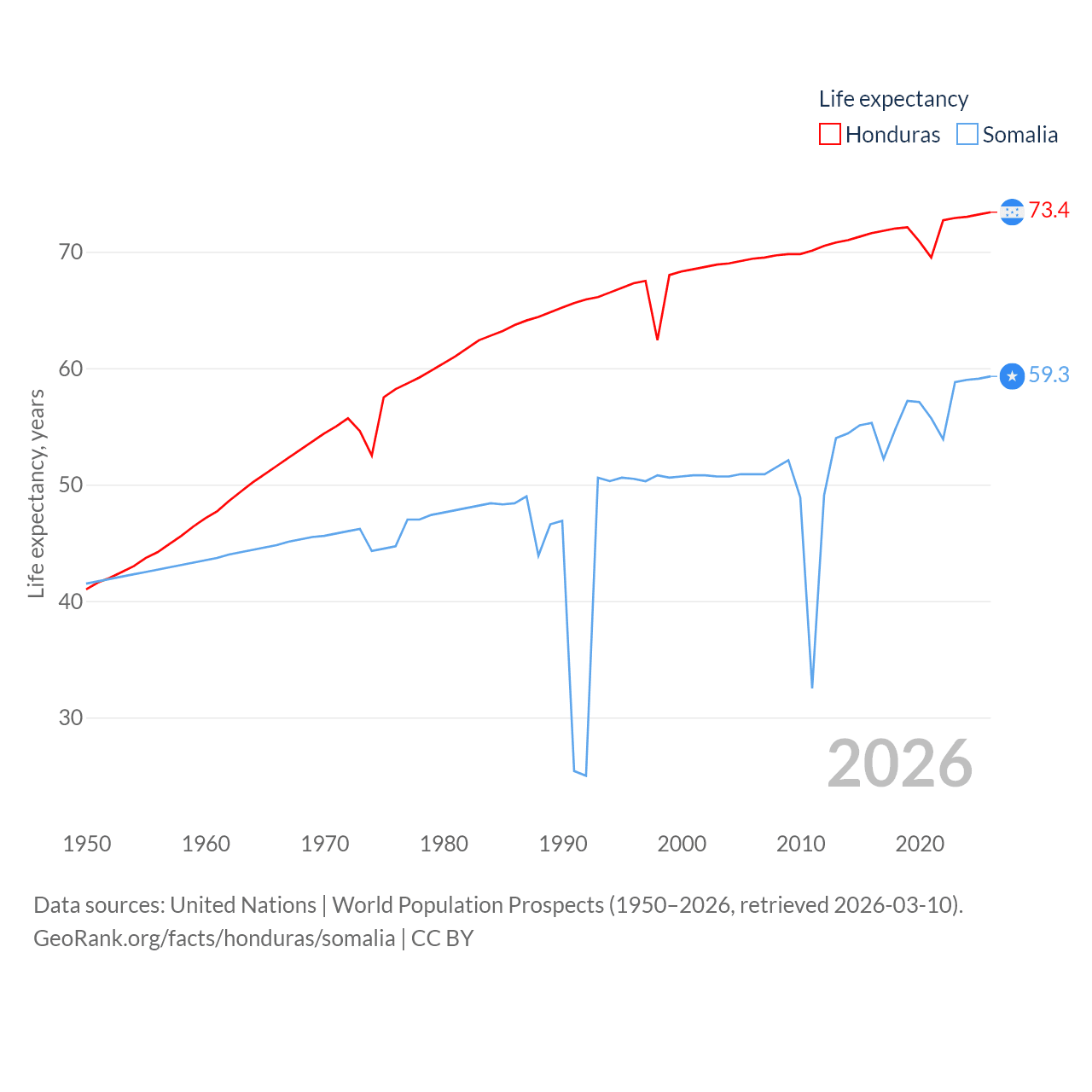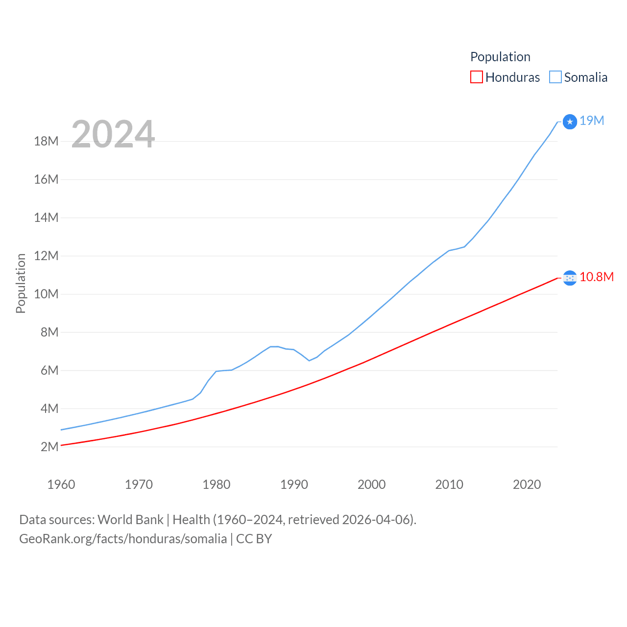 Honduras has a population of 10.8M (ranked 89/197), compared with 19M in Somalia (ranked 68/197). Honduras' land area is 43,201 sq mi versus 242,217 sq mi for Somalia (ranked 100th vs. 42nd).