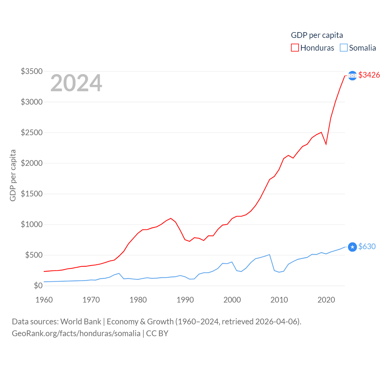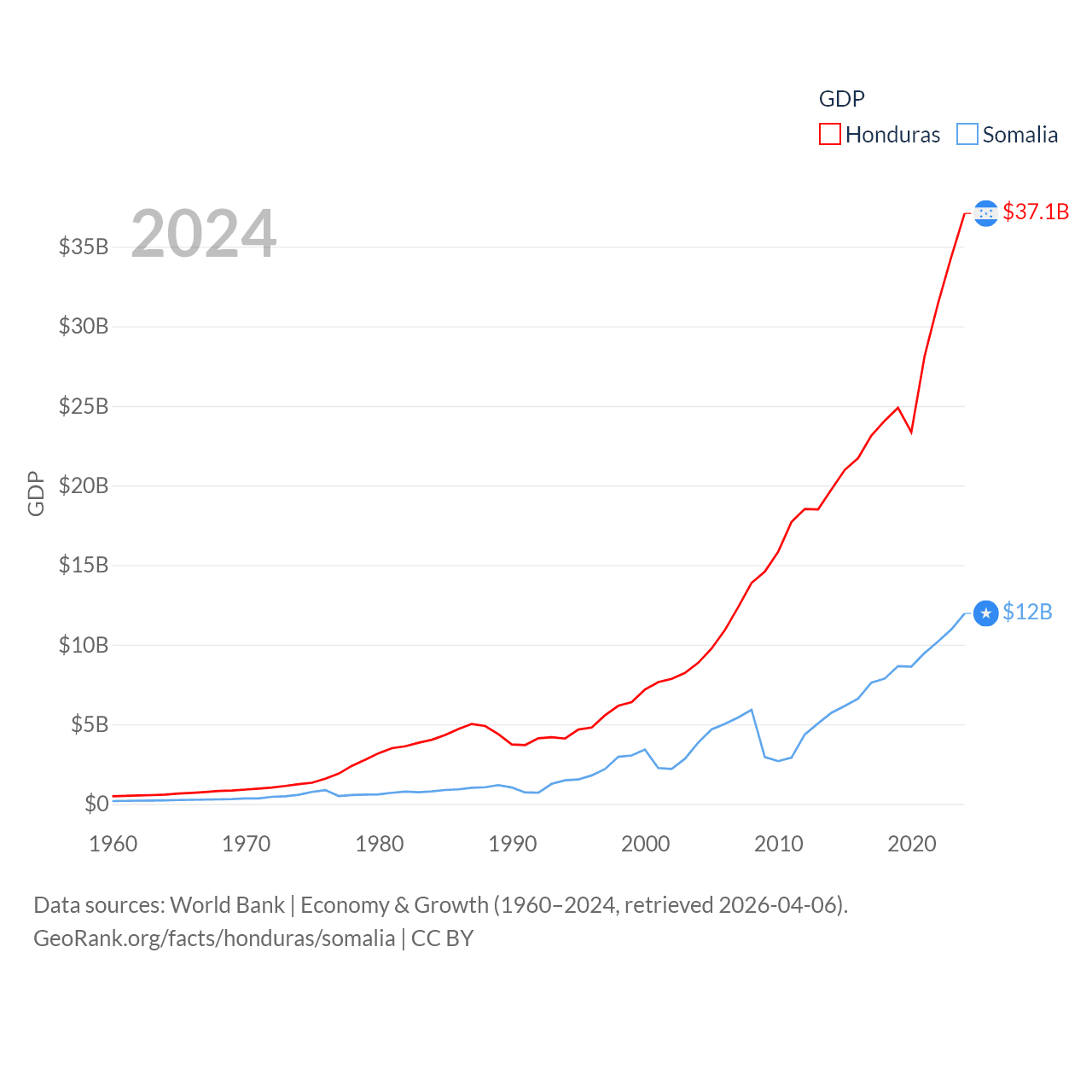 By GDP, Honduras ranks 104/197 ($37.1B) and Somalia ranks 150/197 ($12B). By GDP per capita, Honduras ranks 136/197 ($3,426), while Somalia ranks 192/197 ($630).