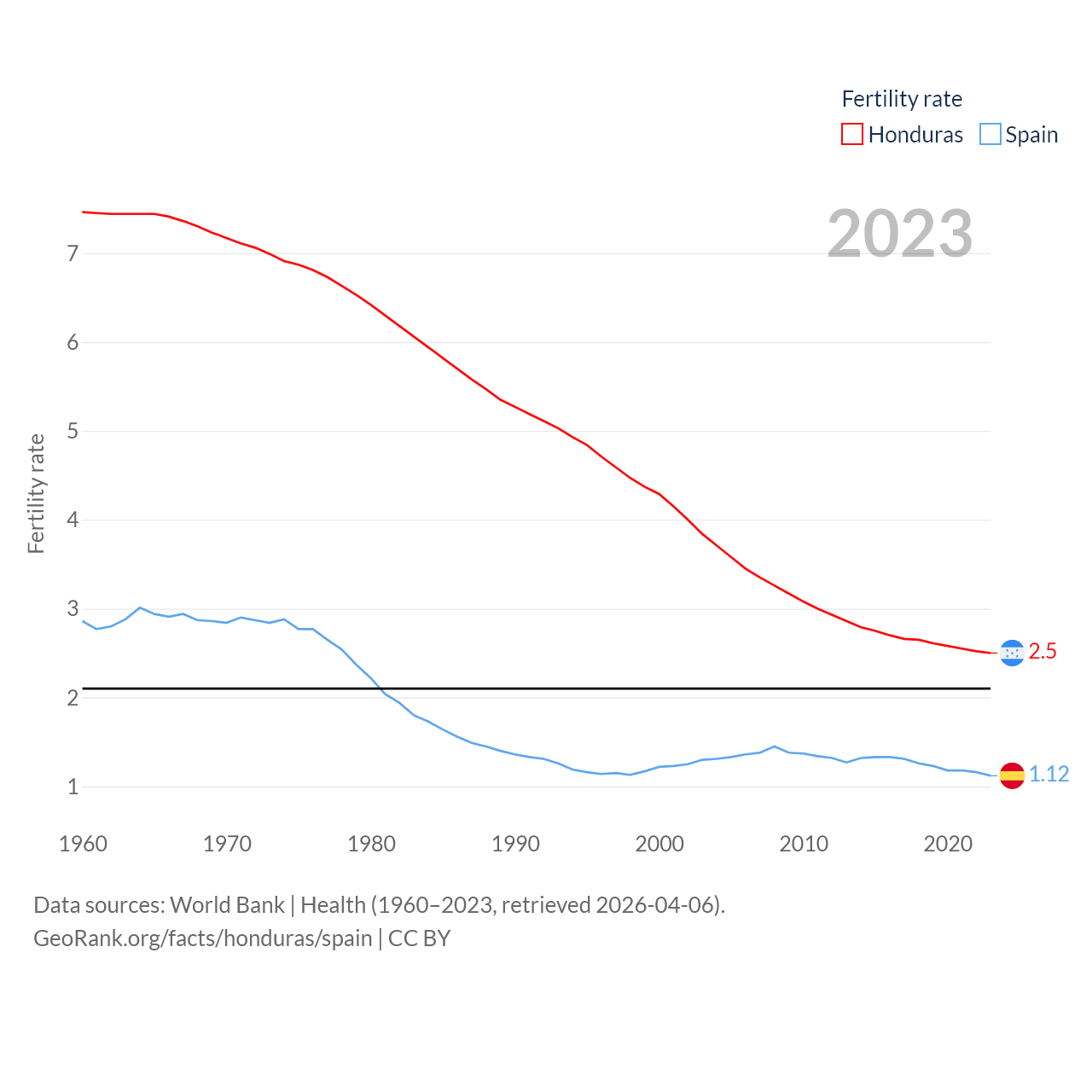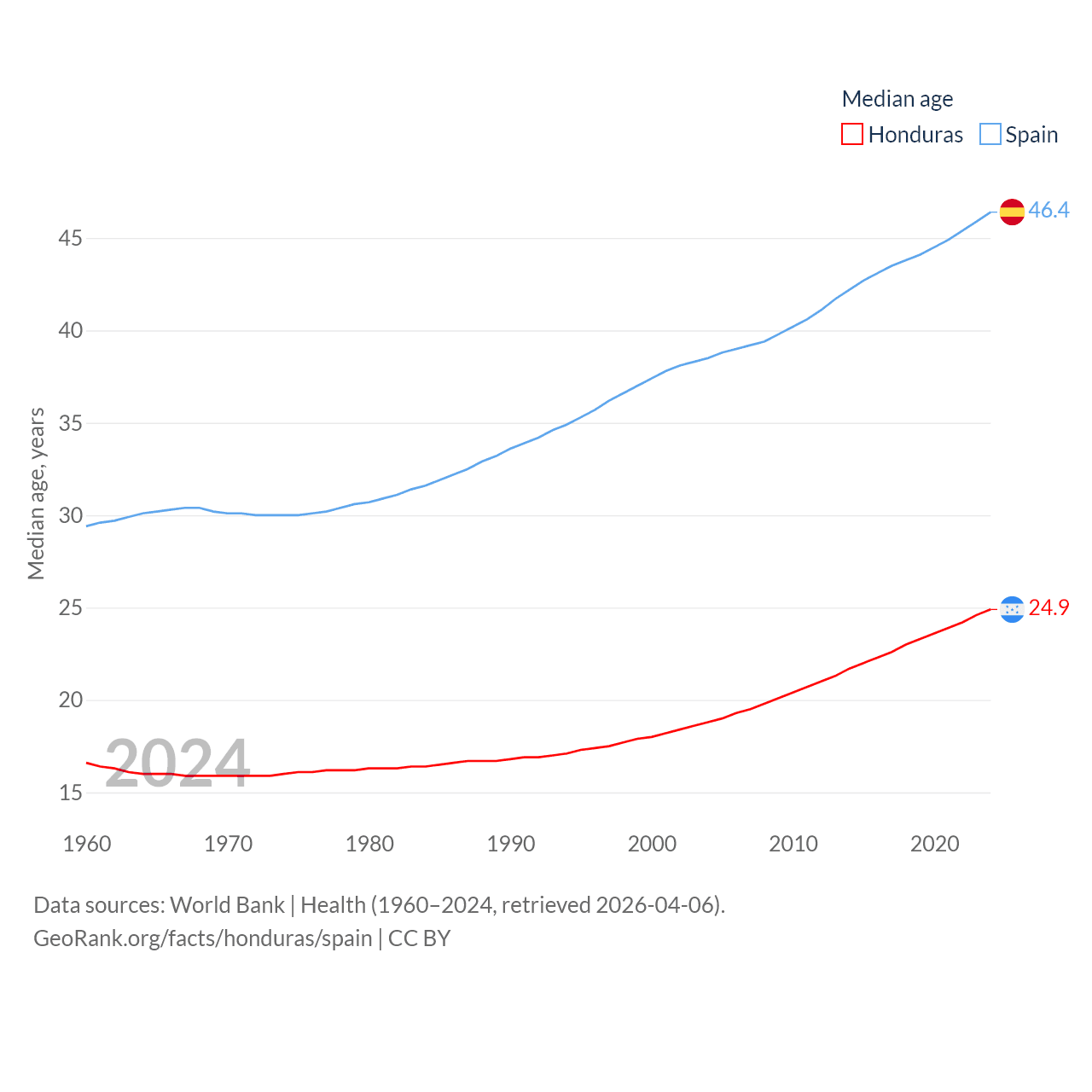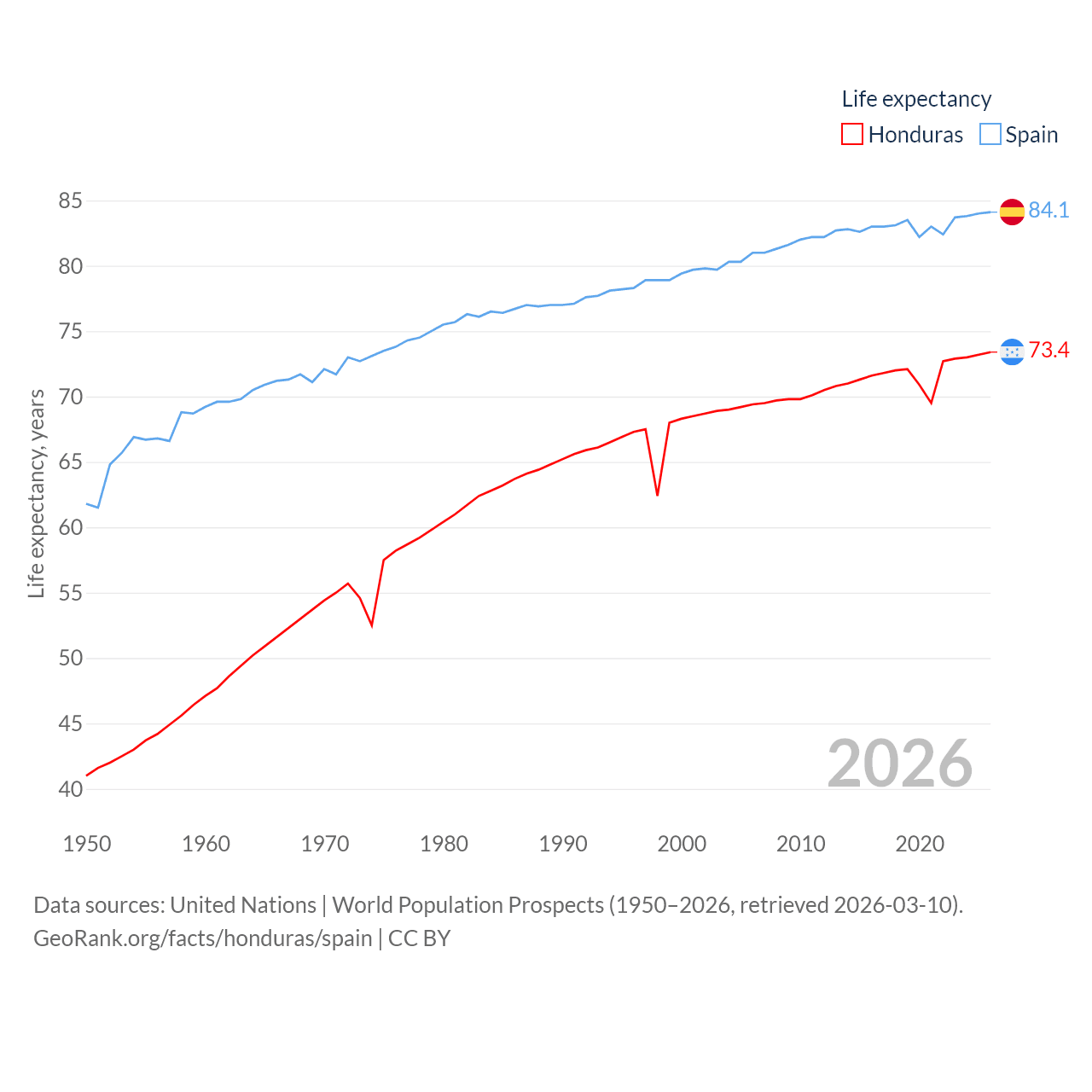 Honduras has a population of 10.8M (ranked 89/197), compared with 48.8M in Spain (ranked 32/197). Honduras' land area is 43,201 sq mi versus 192,934 sq mi for Spain (ranked 100th vs. 51st).