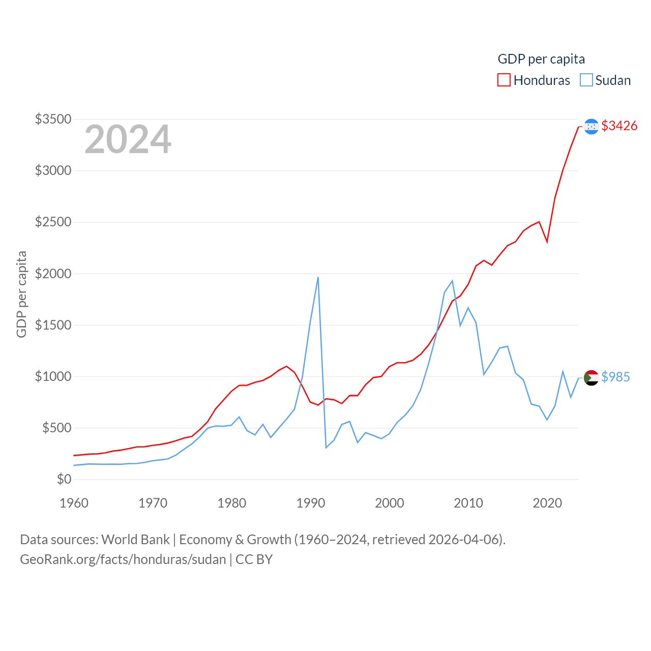 By GDP, Honduras ranks 104/197 ($37.1B) and Sudan ranks 94/197 ($49.7B). By GDP per capita, Honduras ranks 136/197 ($3,426), while Sudan ranks 179/197 ($985).