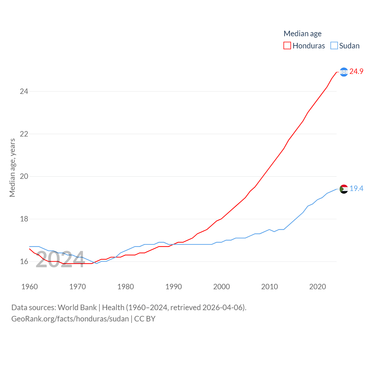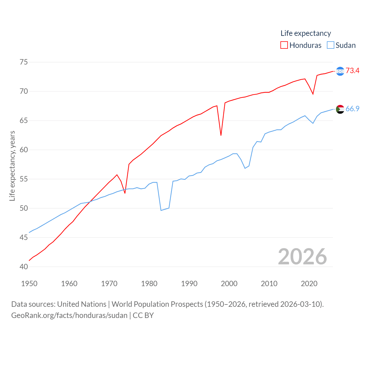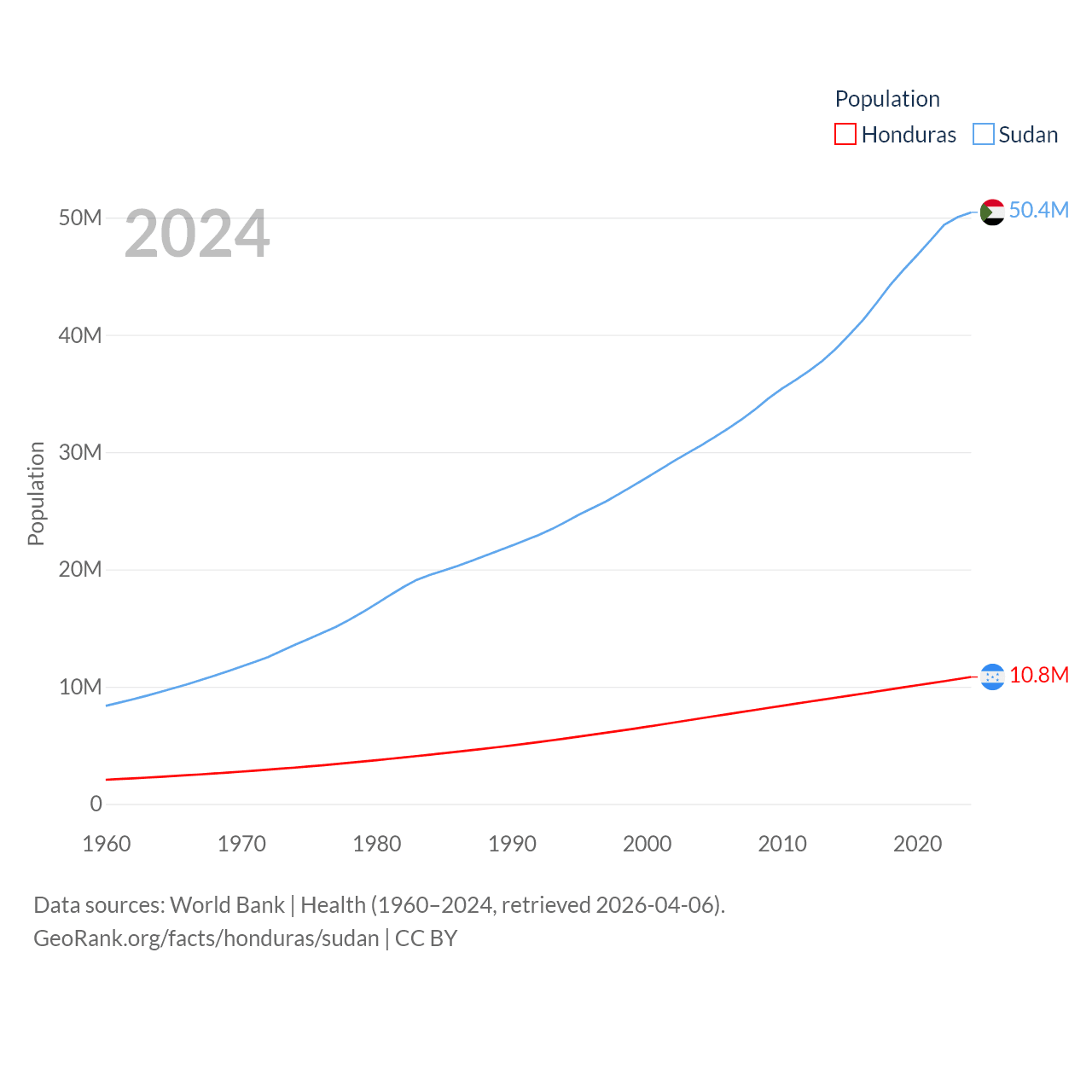 Honduras has a population of 10.8M (ranked 89/197), compared with 50.4M in Sudan (ranked 30/197). Honduras' land area is 43,201 sq mi versus 721,239 sq mi for Sudan (ranked 100th vs. 15th).