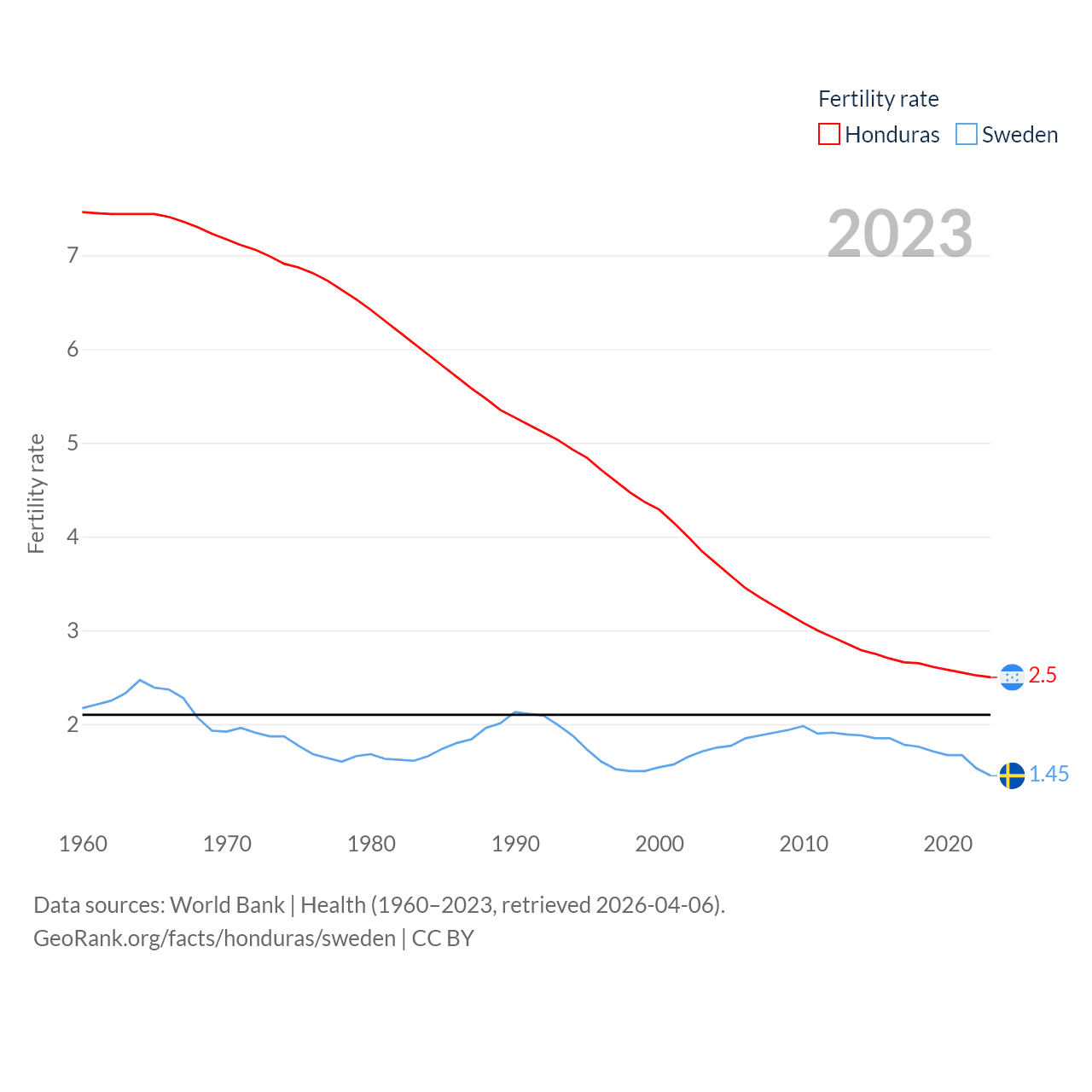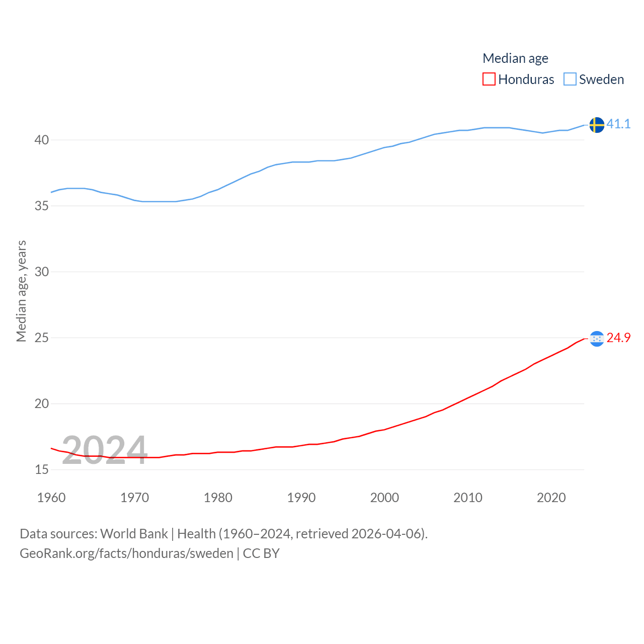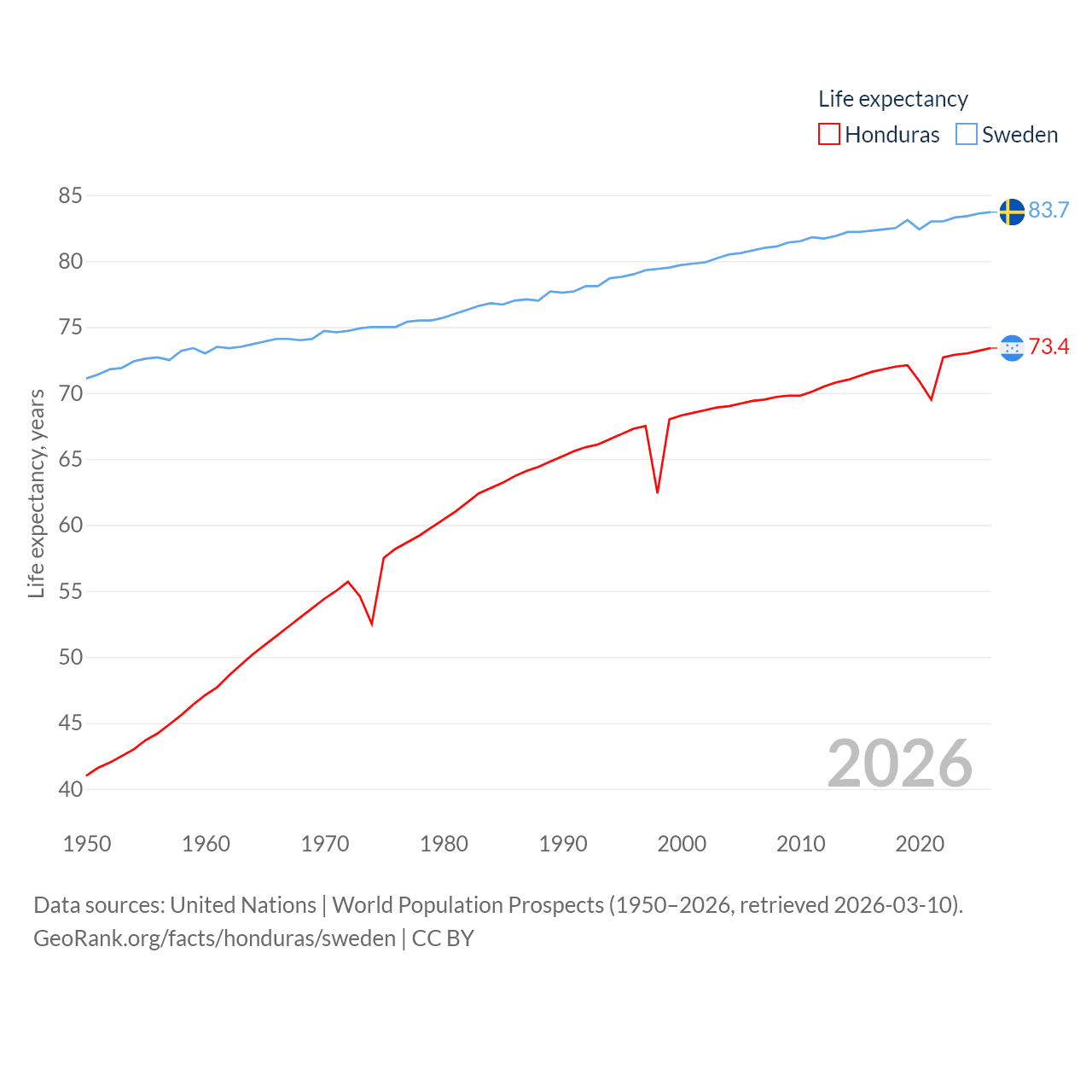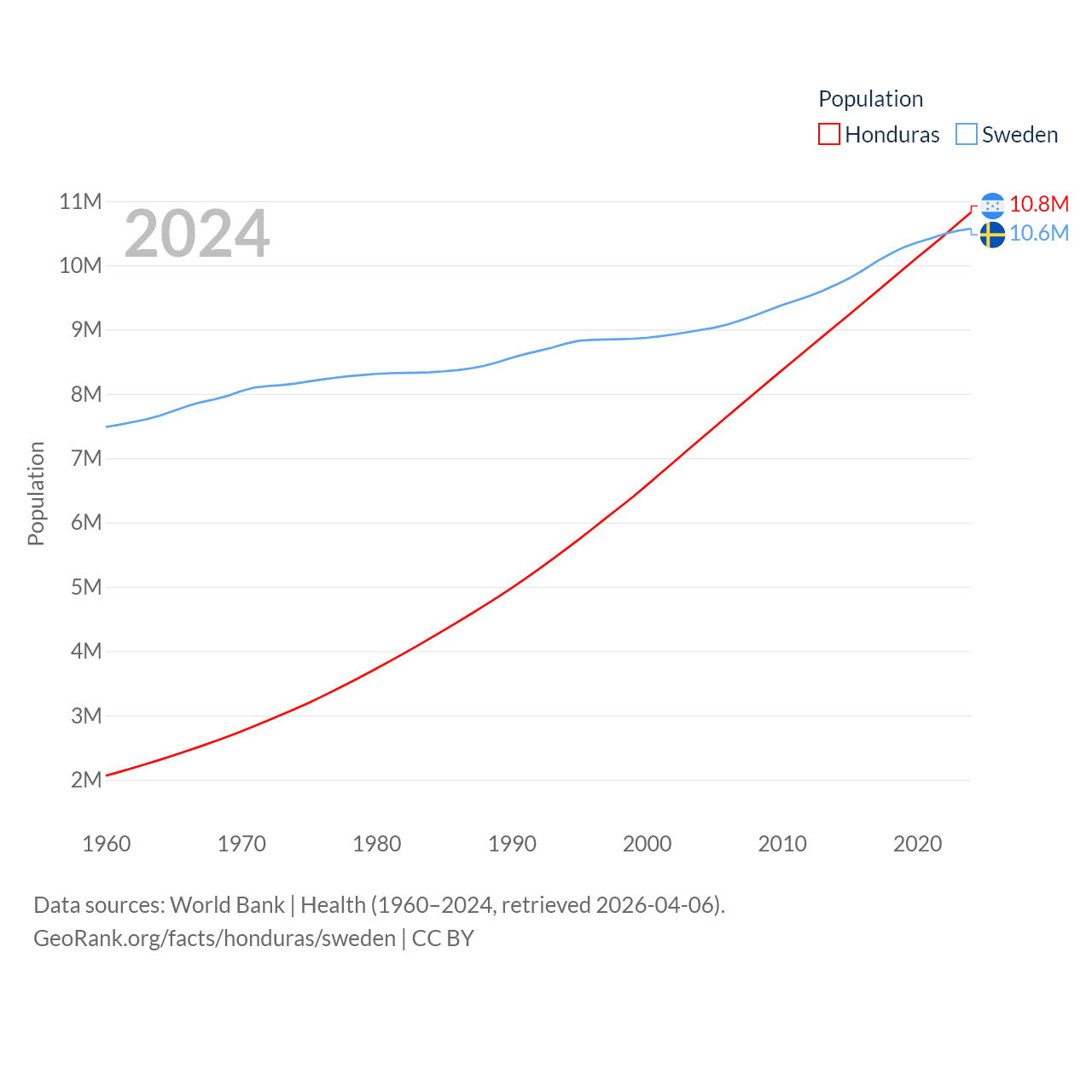 Honduras has a population of 10.8M (ranked 89/197), compared with 10.6M in Sweden (ranked 93/197). Honduras' land area is 43,201 sq mi versus 157,248 sq mi for Sweden (ranked 100th vs. 58th).