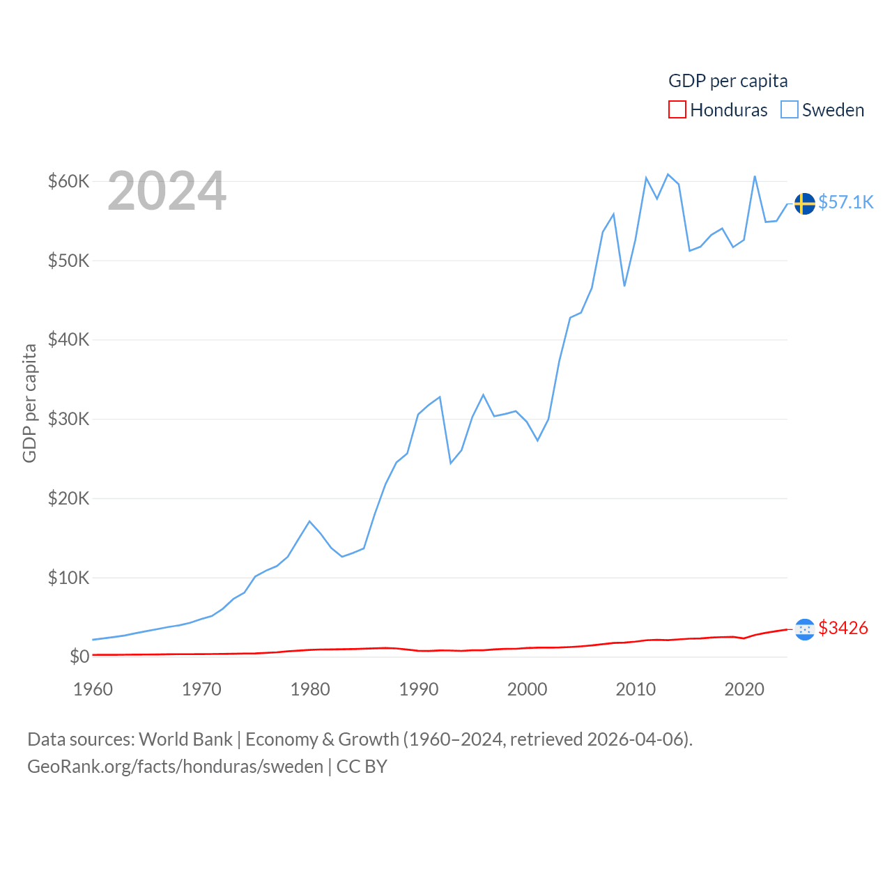 By GDP, Honduras ranks 104/197 ($37.1B) and Sweden ranks 26/197 ($604B). By GDP per capita, Honduras ranks 136/197 ($3,426), while Sweden ranks 17/197 ($57,117).