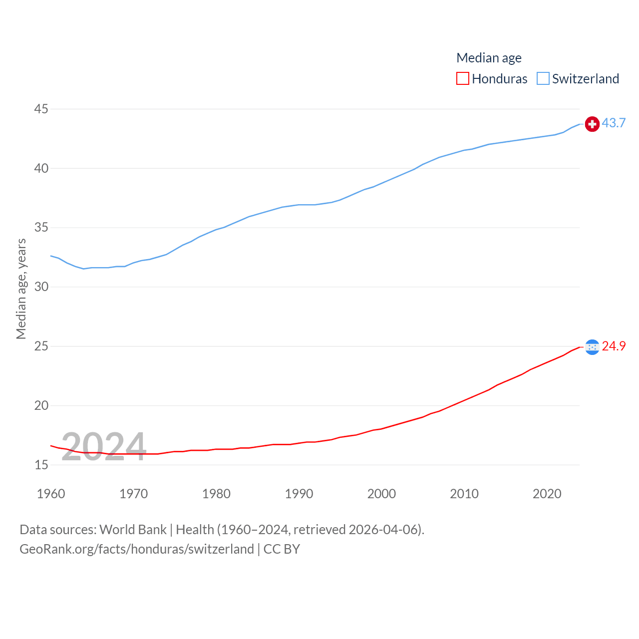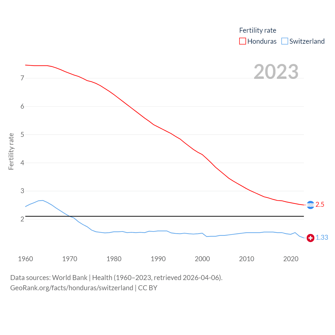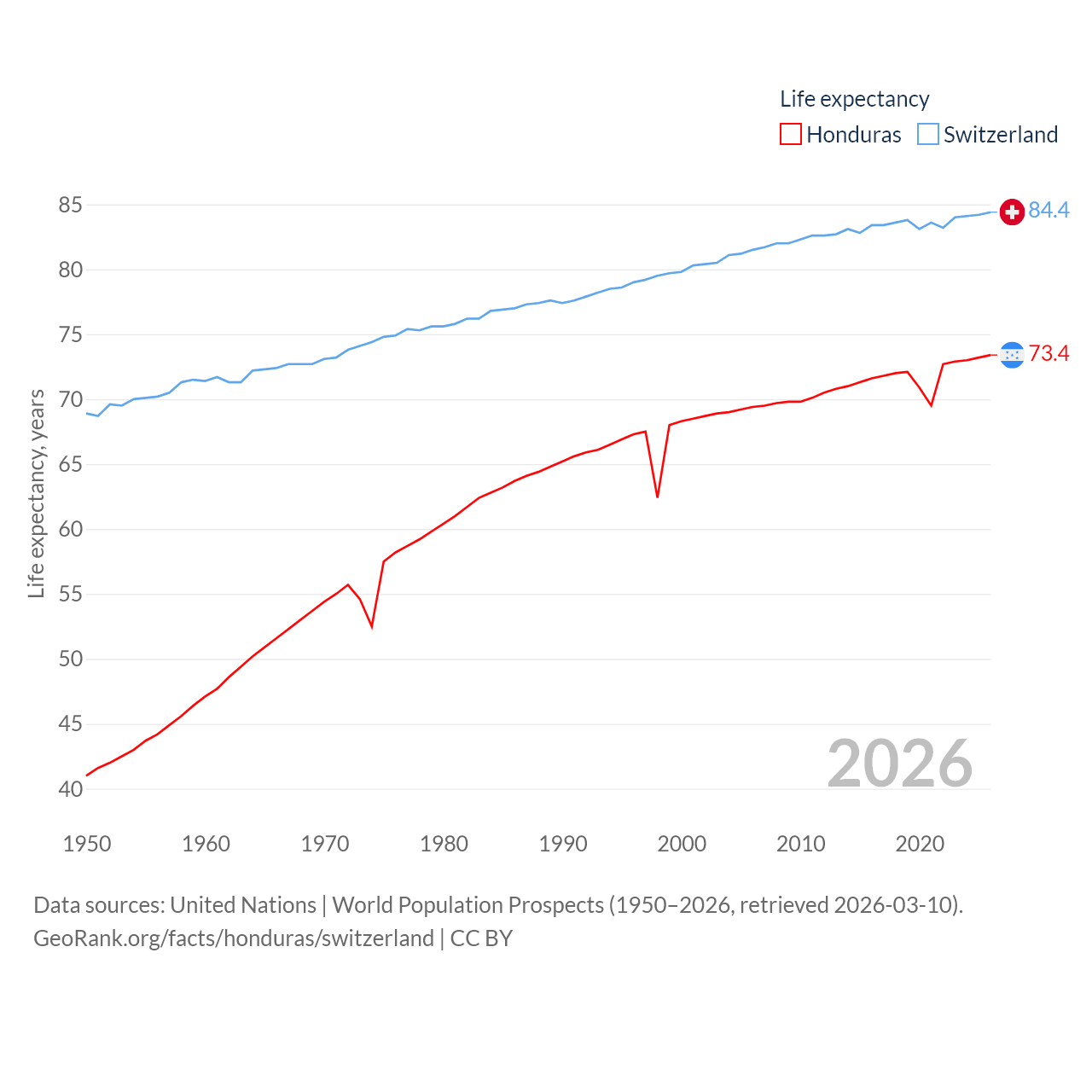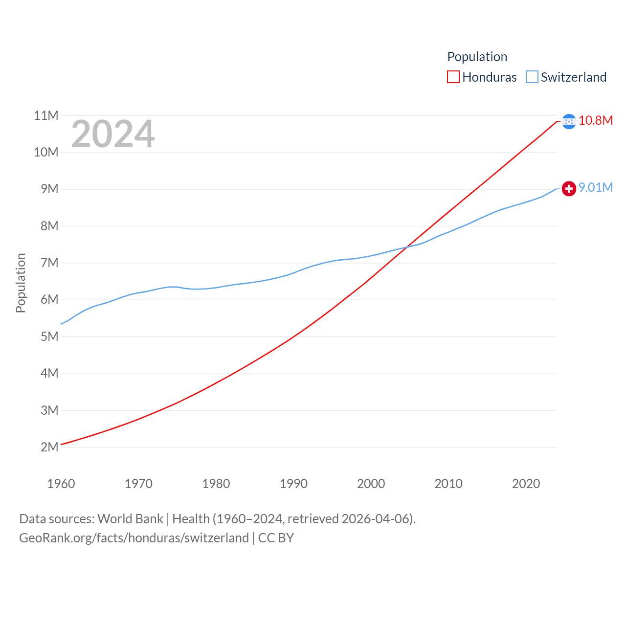 Honduras has a population of 10.8M (ranked 89/197), compared with 9.01M in Switzerland (ranked 101/197). Honduras' land area is 43,201 sq mi versus 15,255 sq mi for Switzerland (ranked 100th vs. 131st).