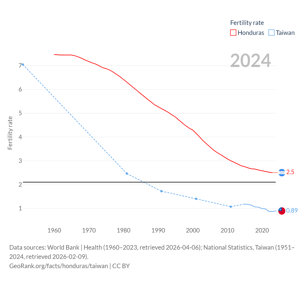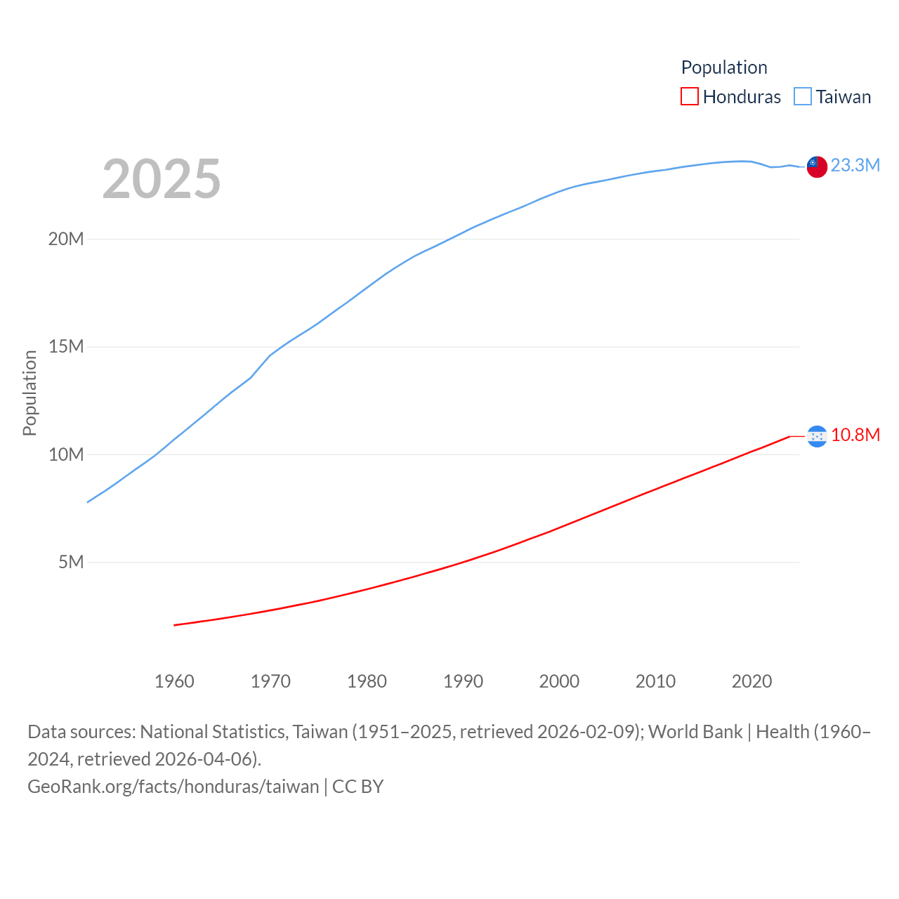 Honduras has a population of 10.8M (ranked 89/197), compared with 23.3M in Taiwan (ranked 60/197). Honduras' land area is 43,201 sq mi versus 13,976 sq mi for Taiwan (ranked 100th vs. 133rd).