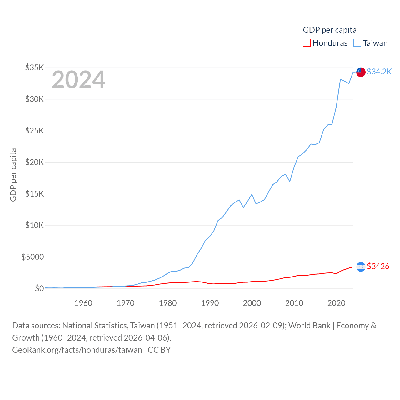 By GDP, Honduras ranks 104/197 ($37.1B) and Taiwan ranks 22/197 ($802B). By GDP per capita, Honduras ranks 136/197 ($3,426), while Taiwan ranks 35/197 ($34,238).