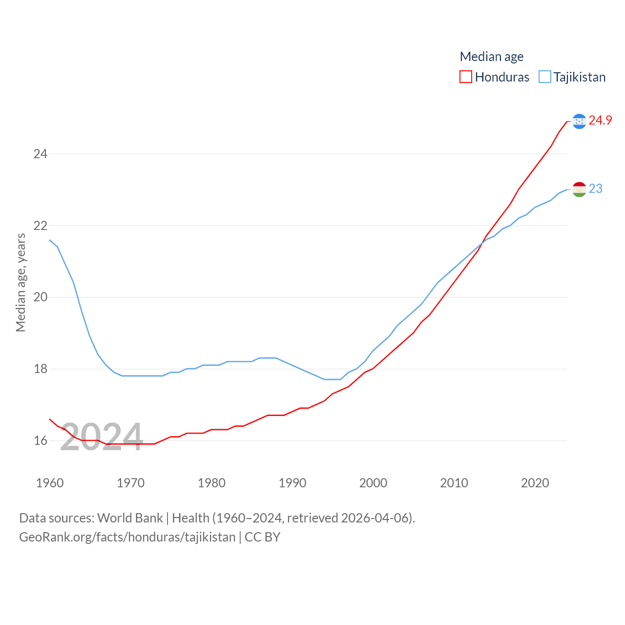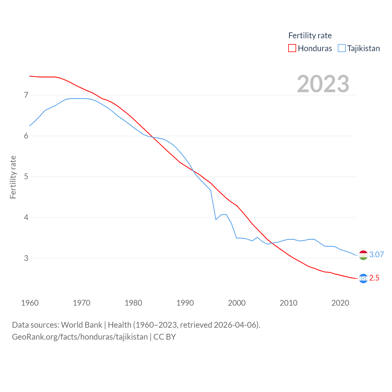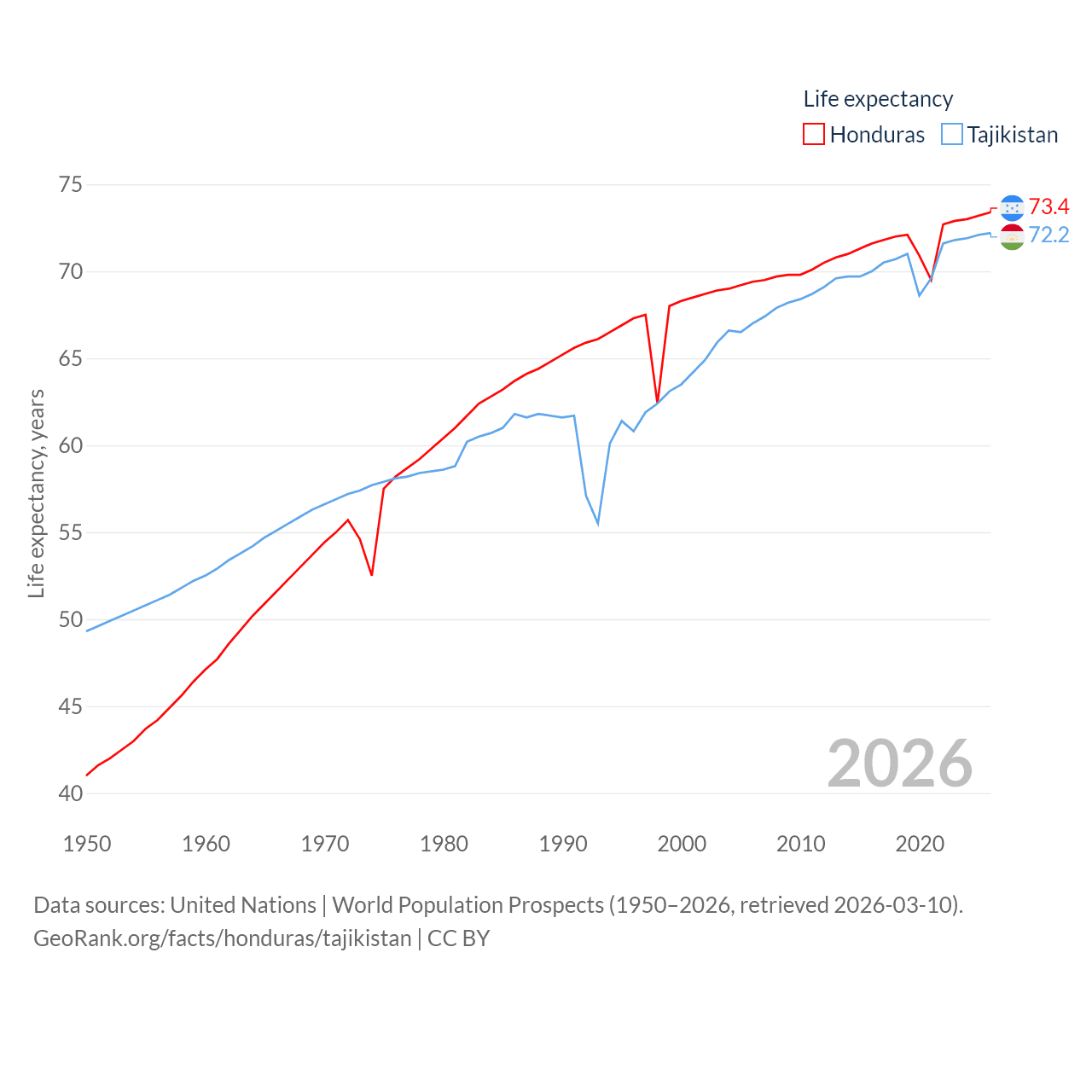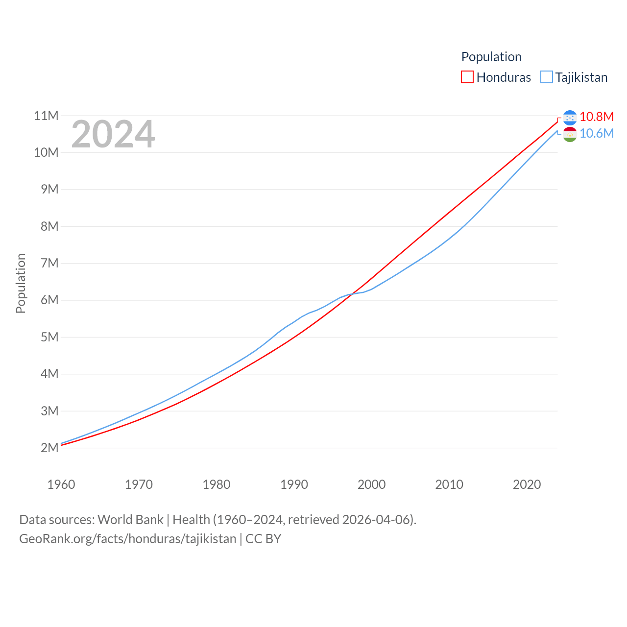 Honduras has a population of 10.8M (ranked 89/197), compared with 10.6M in Tajikistan (ranked 91/197). Honduras' land area is 43,201 sq mi versus 53,587 sq mi for Tajikistan (ranked 100th vs. 93rd).
