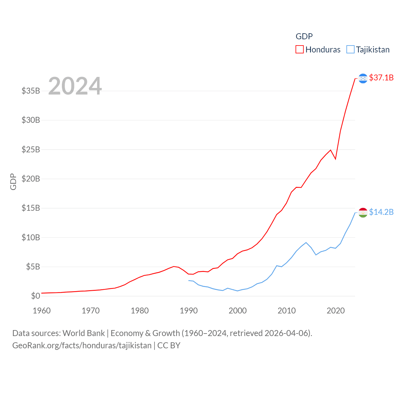 By GDP, Honduras ranks 104/197 ($37.1B) and Tajikistan ranks 145/197 ($14.2B). By GDP per capita, Honduras ranks 136/197 ($3,426), while Tajikistan ranks 166/197 ($1,341).