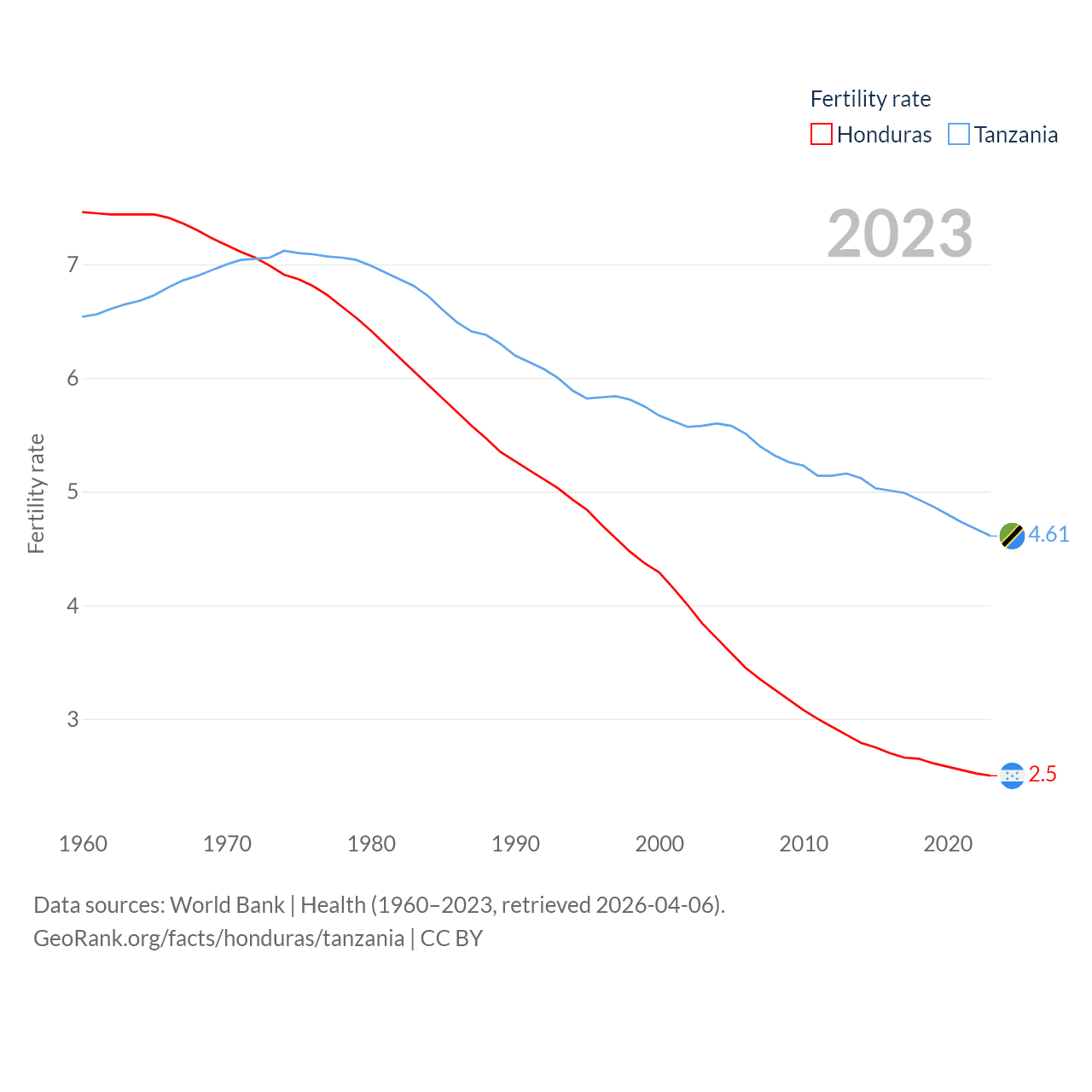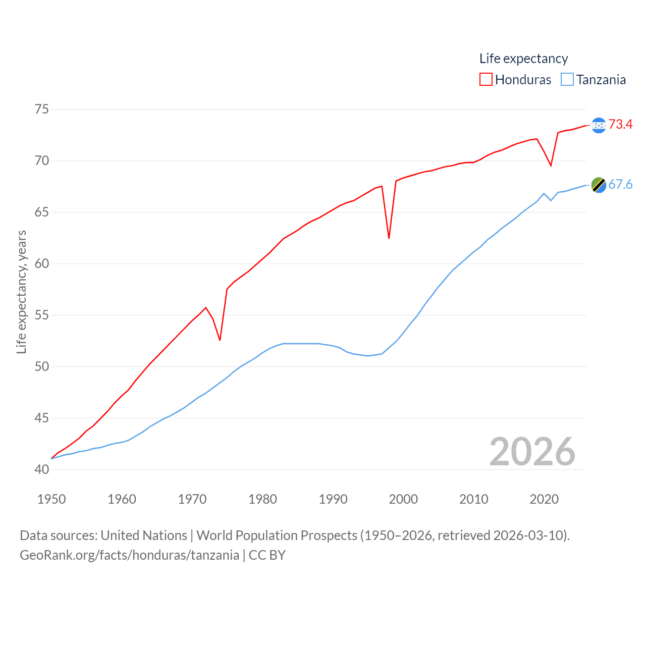 Honduras has a population of 10.8M (ranked 89/197), compared with 68.6M in Tanzania (ranked 22/197). Honduras' land area is 43,201 sq mi versus 342,009 sq mi for Tanzania (ranked 100th vs. 31st).