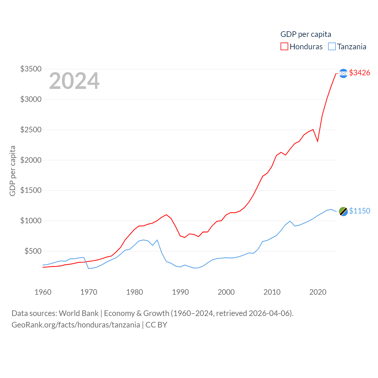 By GDP, Honduras ranks 104/197 ($37.1B) and Tanzania ranks 82/197 ($78.8B). By GDP per capita, Honduras ranks 136/197 ($3,426), while Tanzania ranks 170/197 ($1,150).