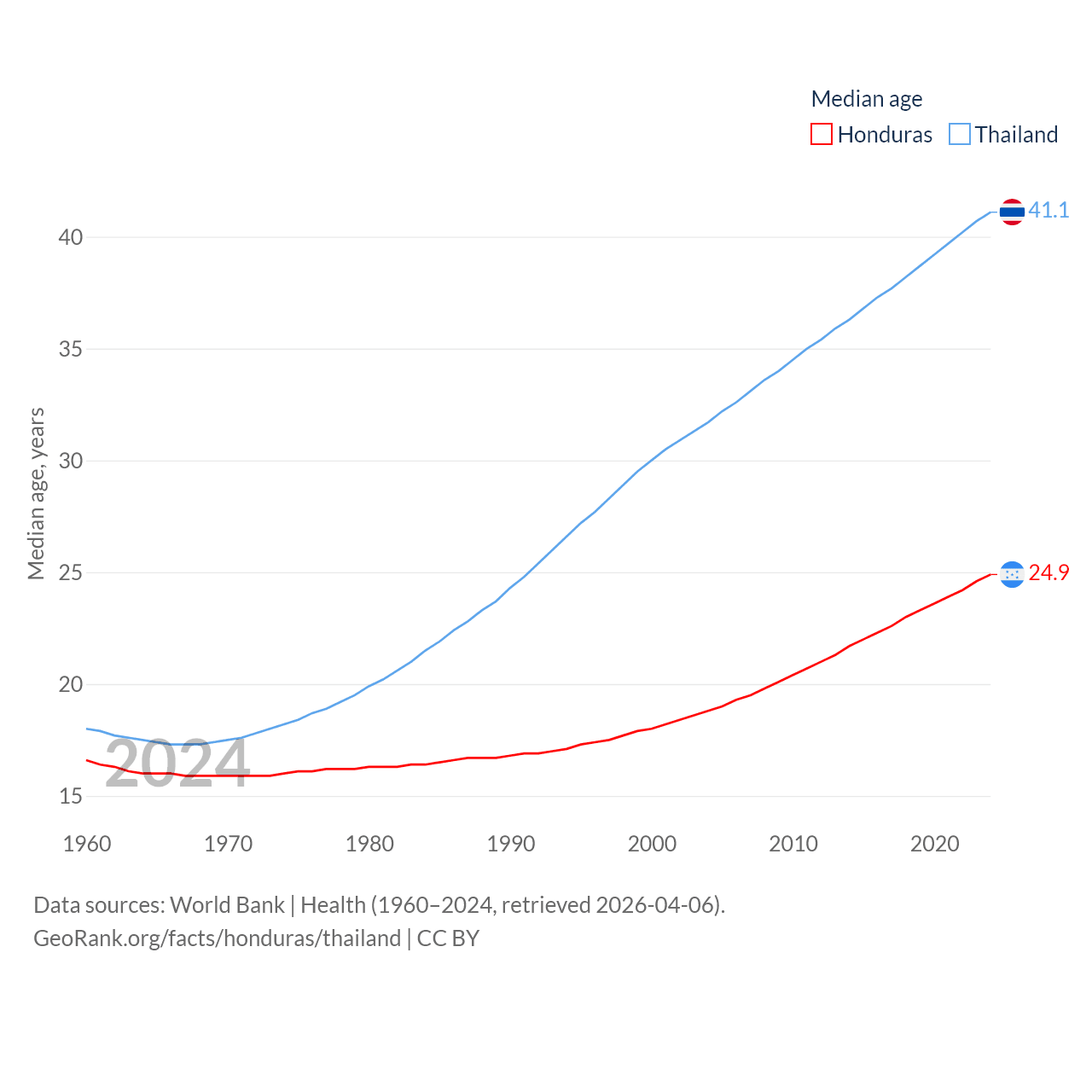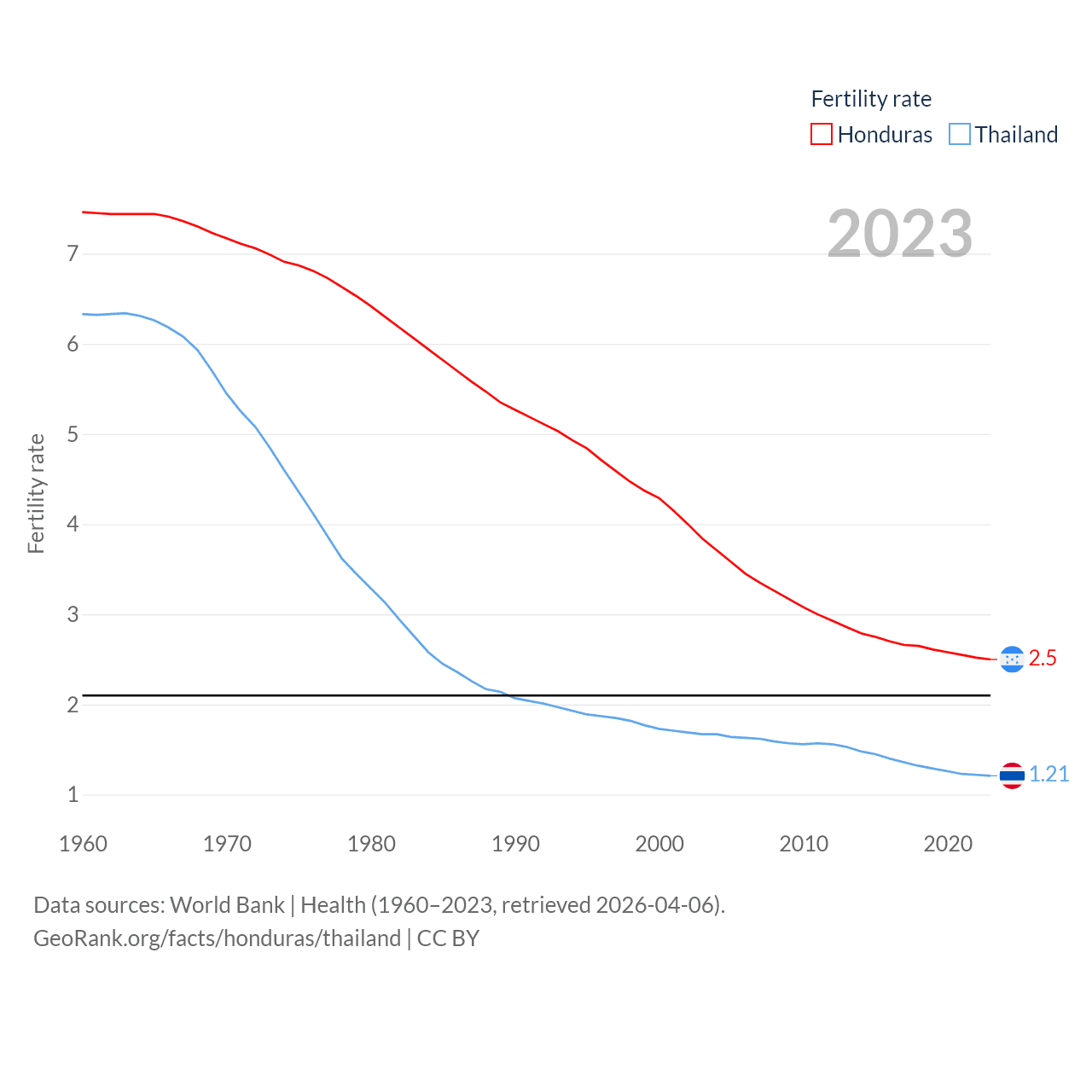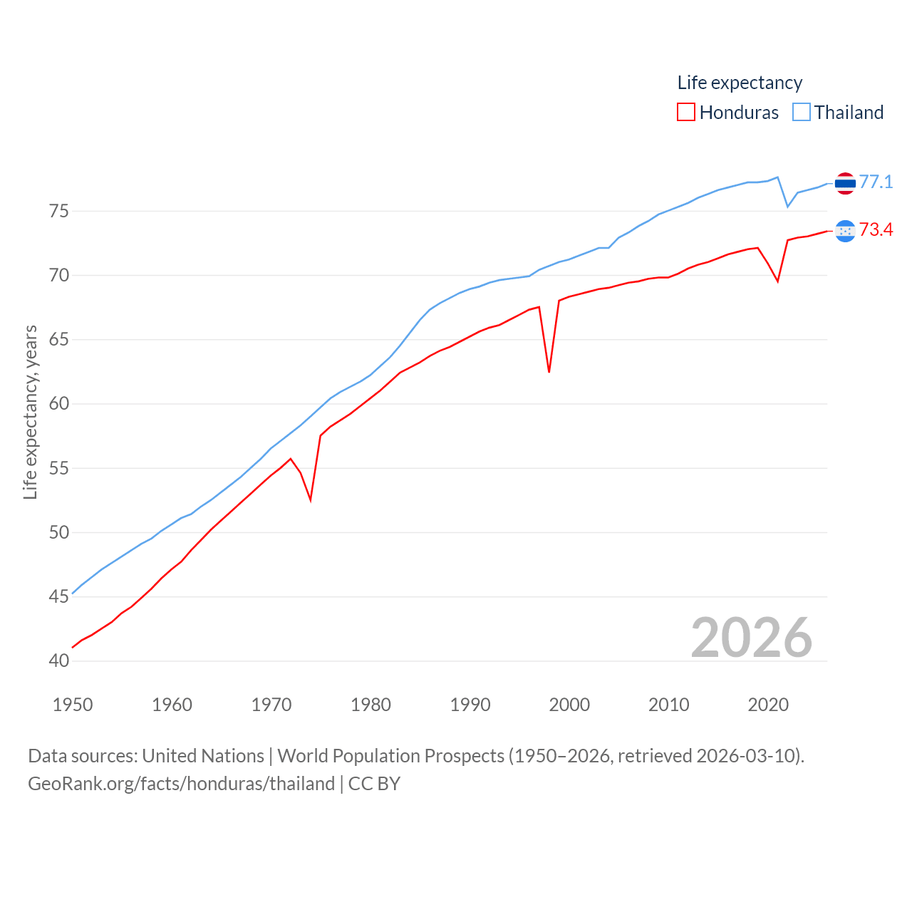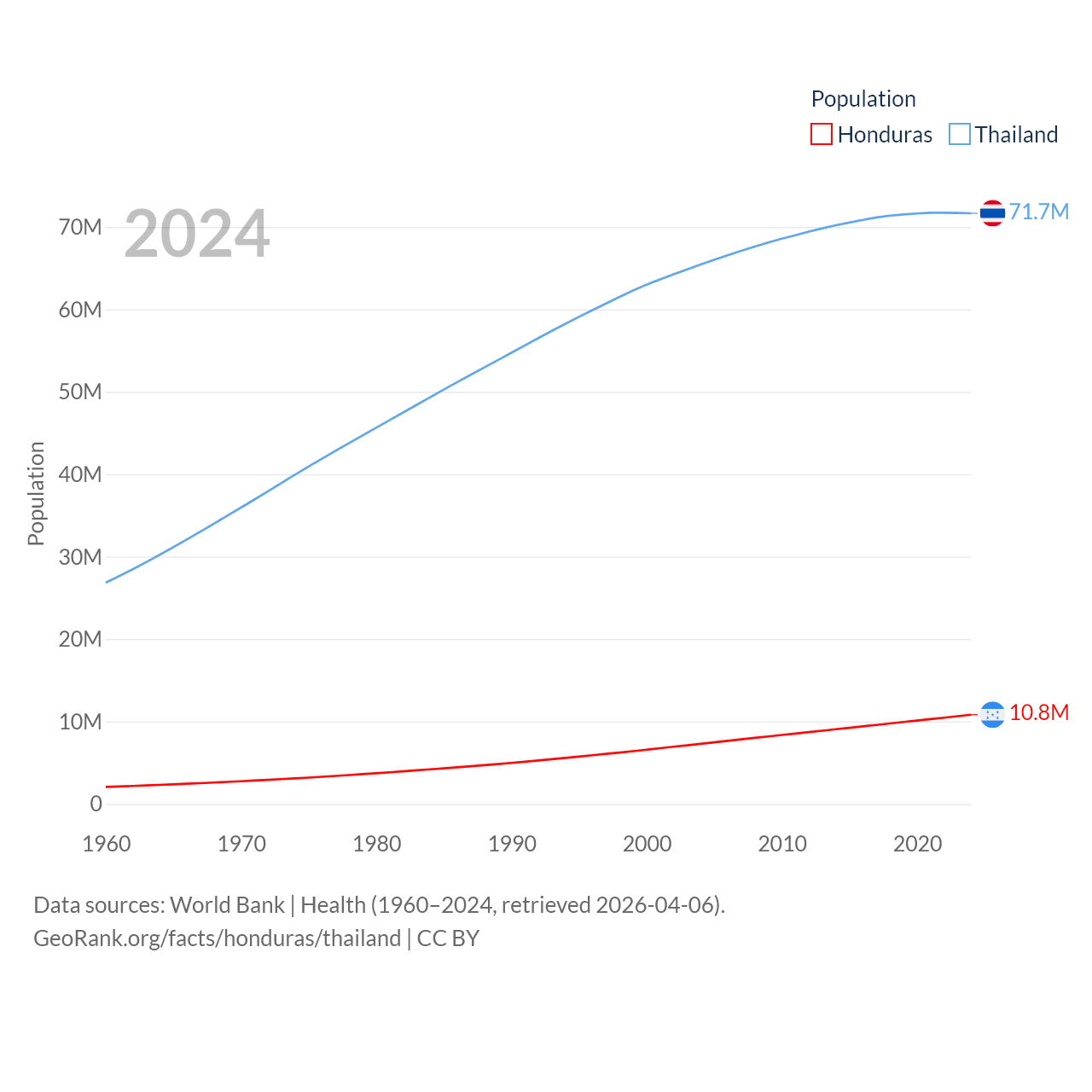 Honduras has a population of 10.8M (ranked 89/197), compared with 71.7M in Thailand (ranked 20/197). Honduras' land area is 43,201 sq mi versus 197,256 sq mi for Thailand (ranked 100th vs. 50th).