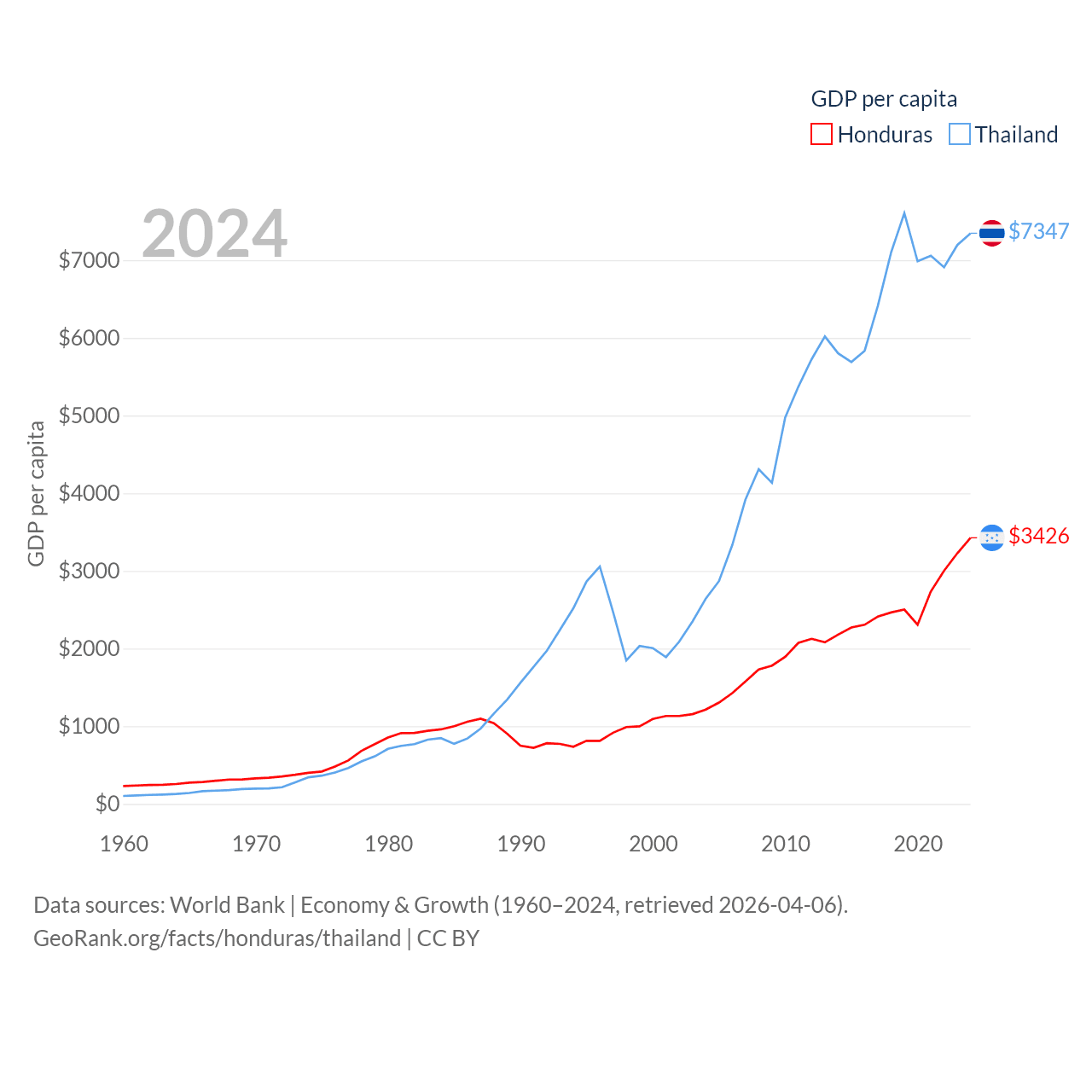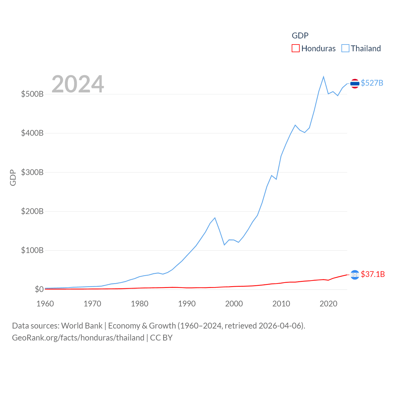 By GDP, Honduras ranks 104/197 ($37.1B) and Thailand ranks 31/197 ($527B). By GDP per capita, Honduras ranks 136/197 ($3,426), while Thailand ranks 100/197 ($7,347).
