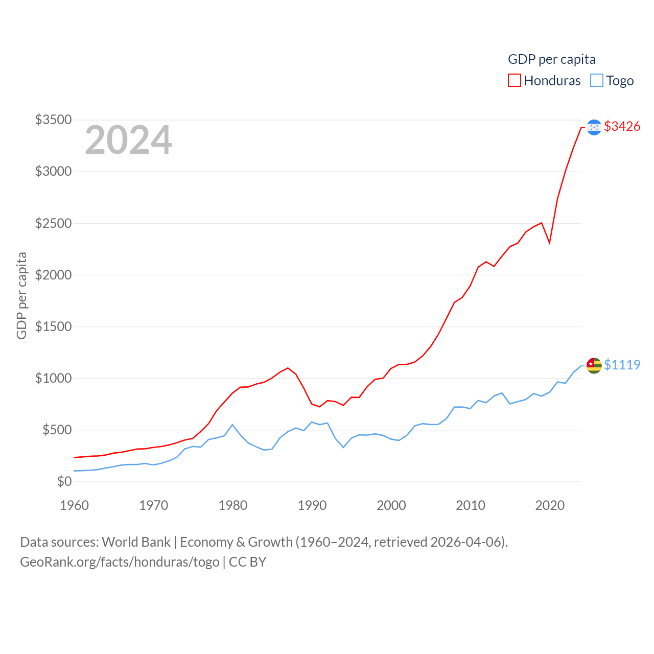 By GDP, Honduras ranks 104/197 ($37.1B) and Togo ranks 154/197 ($10.7B). By GDP per capita, Honduras ranks 136/197 ($3,426), while Togo ranks 172/197 ($1,119).